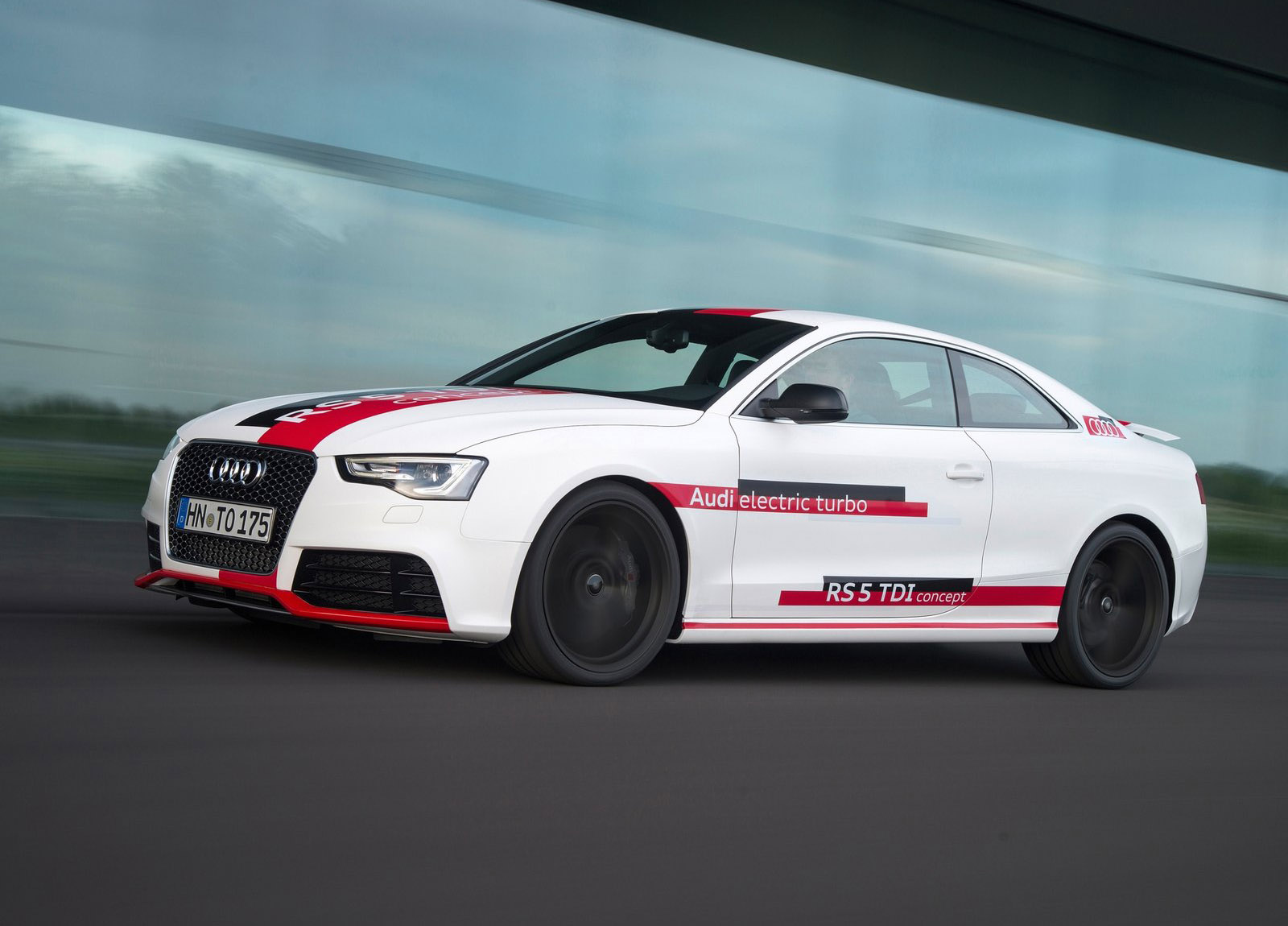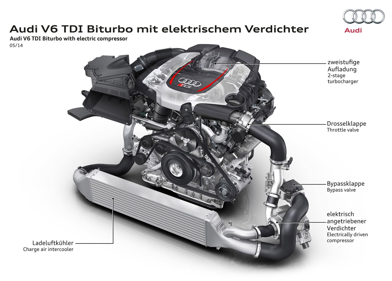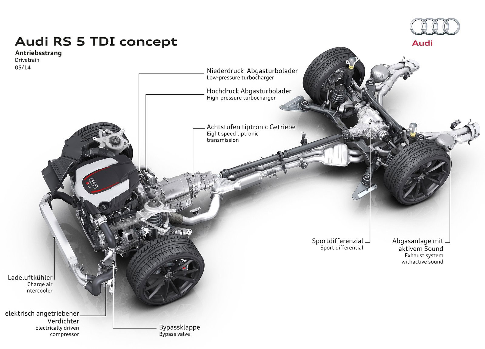 The V6 biturbo in the Audi RS5 TDI concept produces 283 kW (385 hp); from 1,250 to 2,000 rpm it transfers 750 Nm (553.2 lb-ft) of torque to the crankshaft. The red-line is at 5,500 rpm. The supplemental electric turbocharger provides for staggering power when starting off. An electric motor replaces the turbine wheel and accelerates the compressor wheel to over 70,000 rpm in a few hundredths of a second. The exhaust turbochargers also provide as much as 2.4 bar of relative boost pressure.