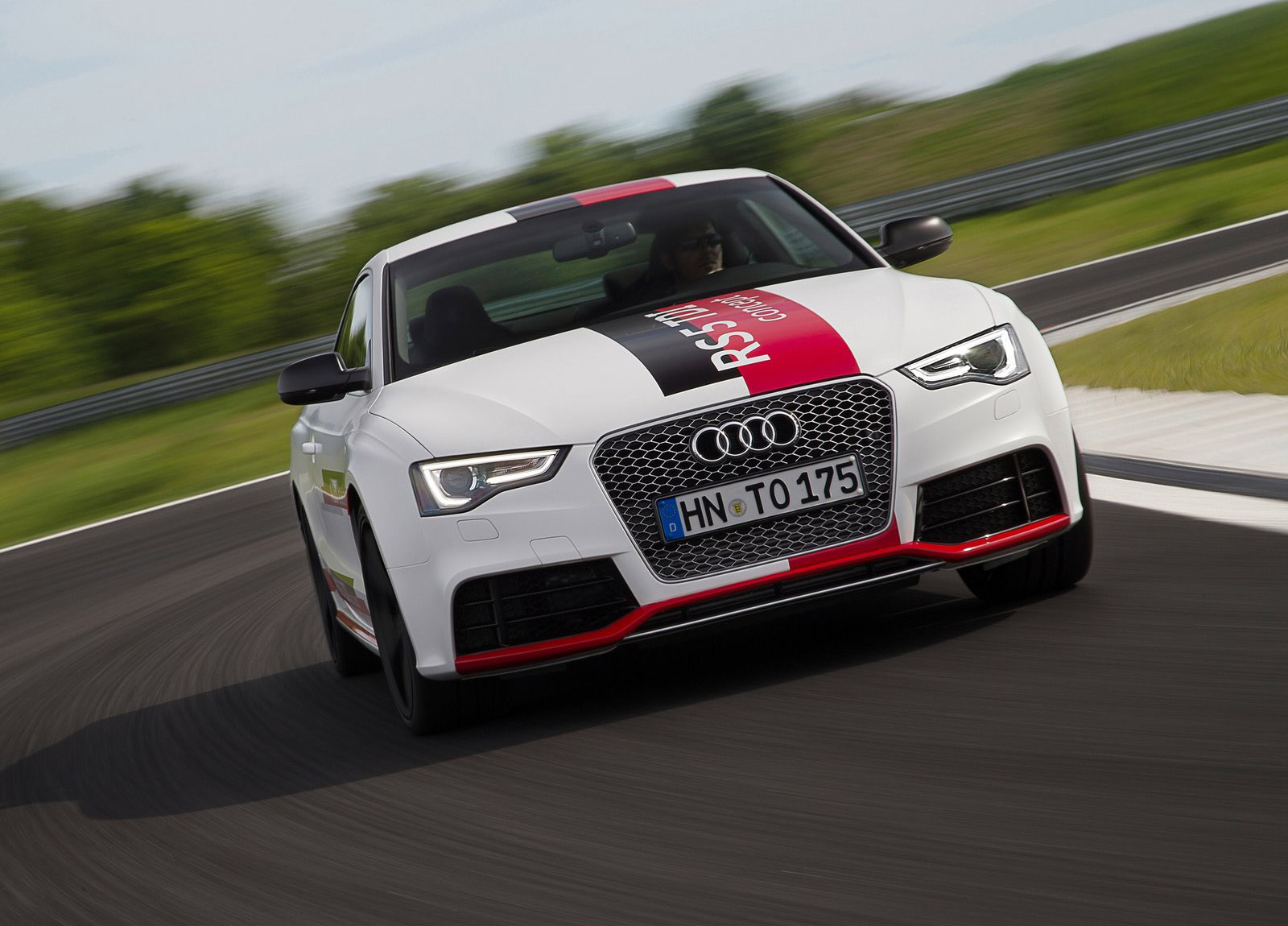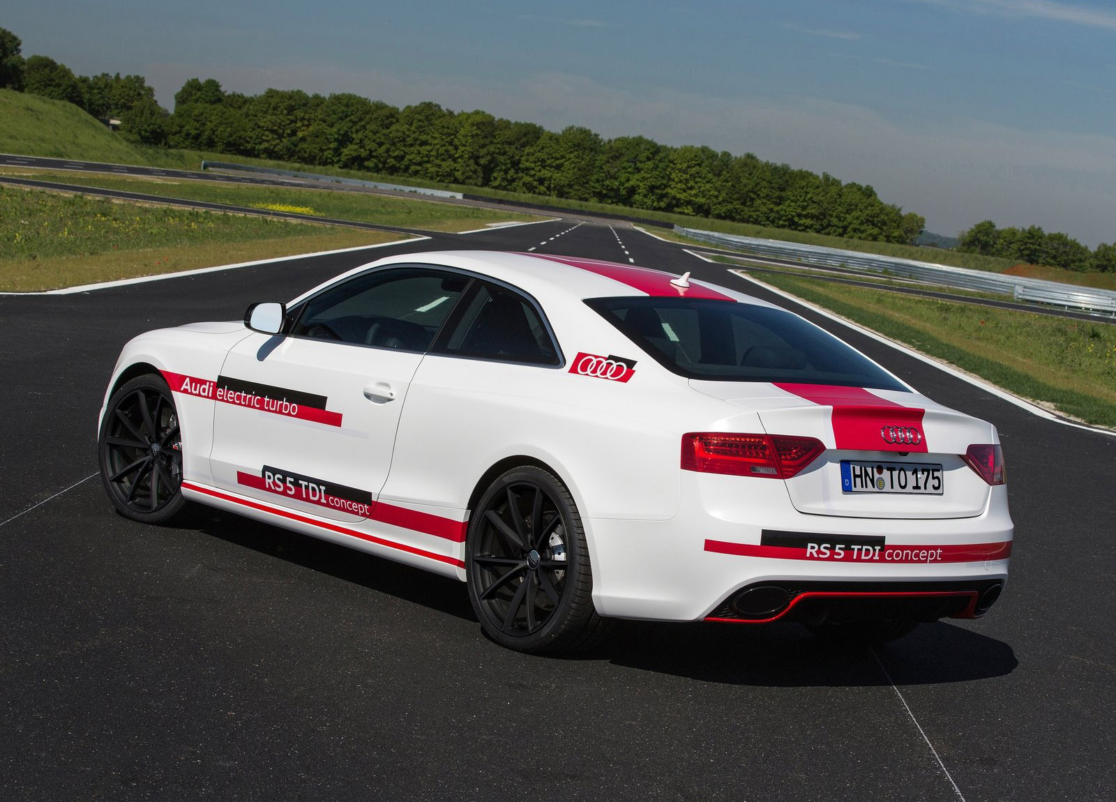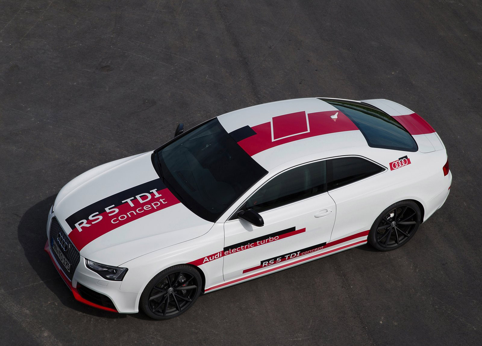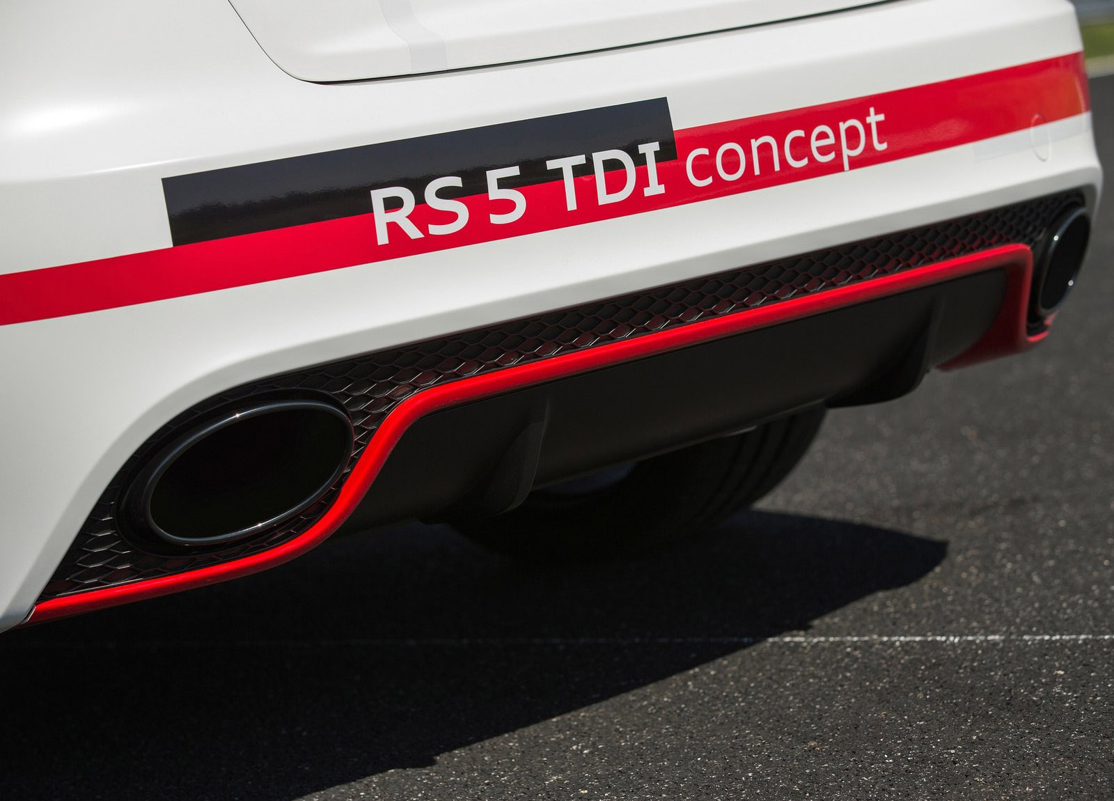 This combination enables the Audi RS5 TDI concept to sprint from 0 to 100 km/h (62.1 mph) in just four seconds. The 200 km/h (124.3 mph) mark is reached in less than 16 seconds, and top speed is 280 km/h (174.0 mph). The average fuel consumption of less than 5.3 liters of diesel per 100 kilometers (less than 140 grams CO2 per kilometer) (44.4 US mpg/225.3 g/mi) documents the outstanding efficiency.