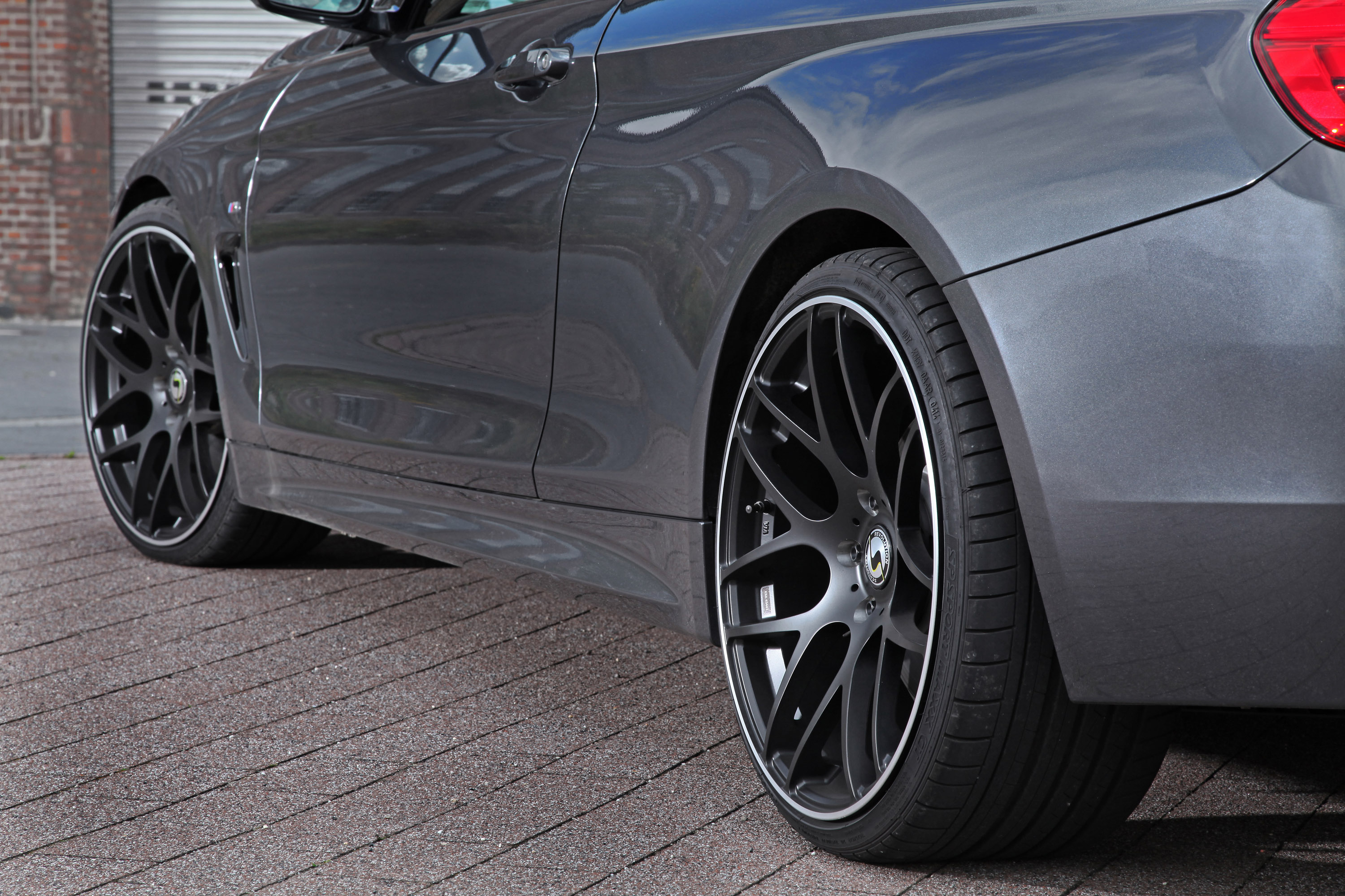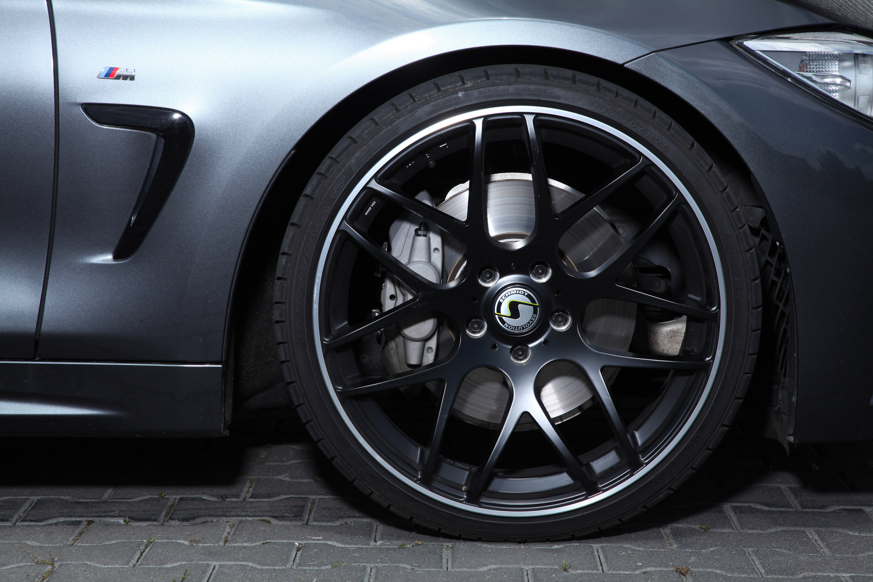 This time, the challenge is to give the still rather young 4-series BMW as follow-up model of the 3-series coupé and cabriolet an individual and distinctive outfit. Optimal starting point is the wheel-tire-combination also for this 435ix. The fruitful co-operation with SCHMIDT GmbH in Bad Segeberg alias "Schmidt Revolution" (www.felge.de) let make the difficult because of the wealth of the offered possibilities choice for the type Gambit in the dimensions 8.5x20" in combination with 235/30-20 tires on the front or 10x20" with 275/25-20 tires on the rear axle. For the complete rim set including tires at least – depending on the tire brand – 2,600.00 Euro are to be called off.