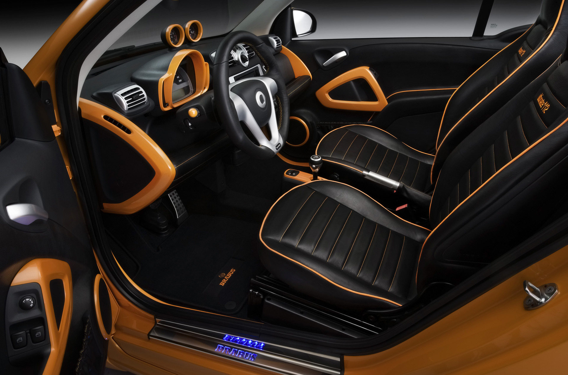 The BRABUS interior concept includes embossed BRABUS emblems as well as instrument panel, instrument bezels, tach, speedometer, clock, turn-signal lever and door handles, all color-coordinated with the exterior. Stainless-steel foot pedals with anti-slip padding together with an aluminum shifter and emergency brake lever add touches of racing atmosphere.