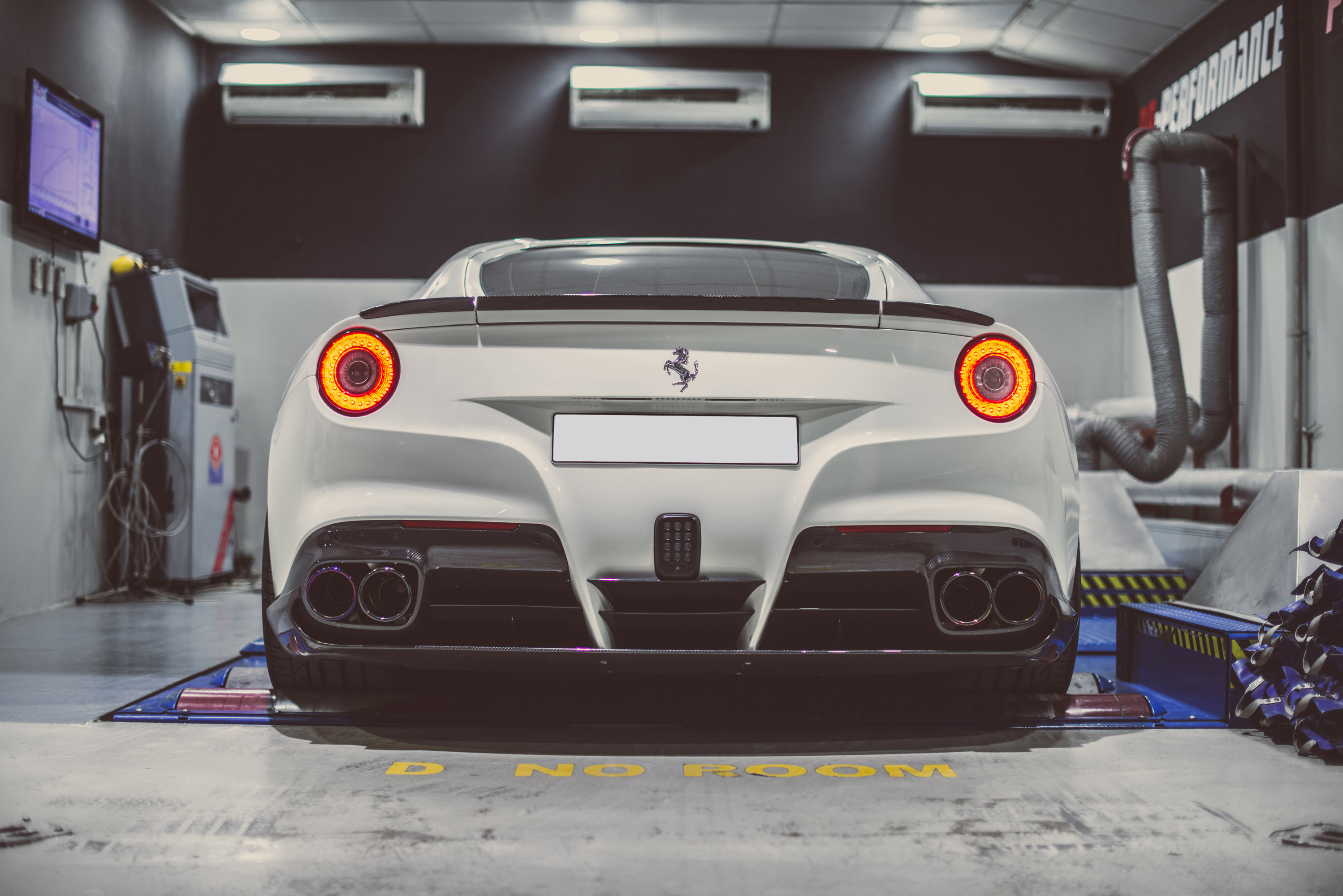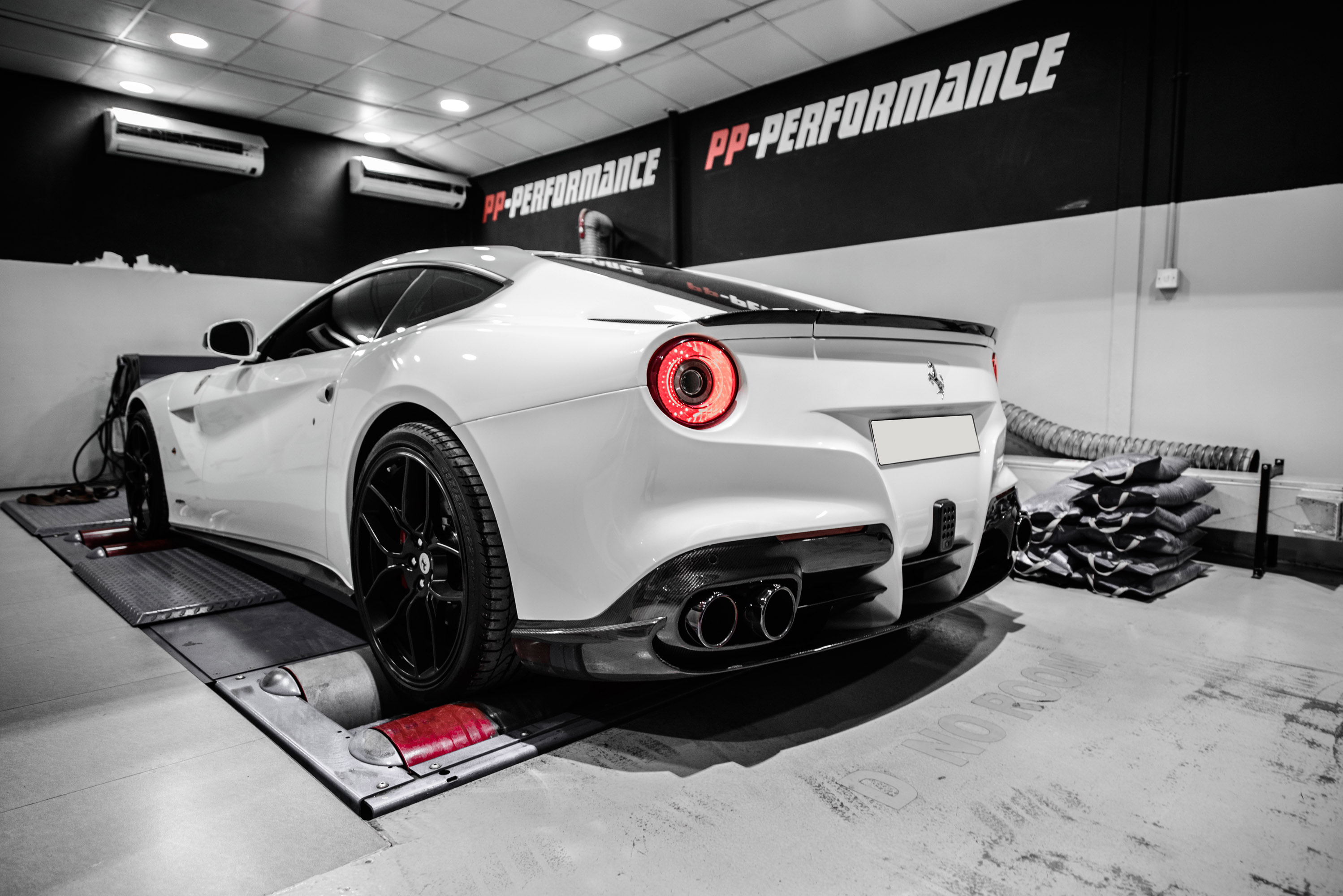 To set one's hand to a Ferrari nearly is lese majesty – from the Italian standpoint. But that is no argument for PP-Performance! This time, the team of professionals in a dauntless way treats a Ferrari F12berlinetta – not in conventional red, by the way, but sooner in innocent white. But the outer appearance does not attract the interest of the Swabian masters of art. Furthermore, the matter is to tune the so called inner values of the bolide. Some few, but nevertheless well conceived modifications are made at Weissbach on the lengthwise in front installed 6.3-liters-V12-engine. There will to be mentioned at first the installation of a BMC Race filter, then the complete FI (Frequency Intelligent) catless exhaust system, which without any doubts has a not insignificant part of the power explosion when acting the accelerator pedal. But the crown of the engine "surgery" is nevertheless the optimization of the engine control by means of company own software.