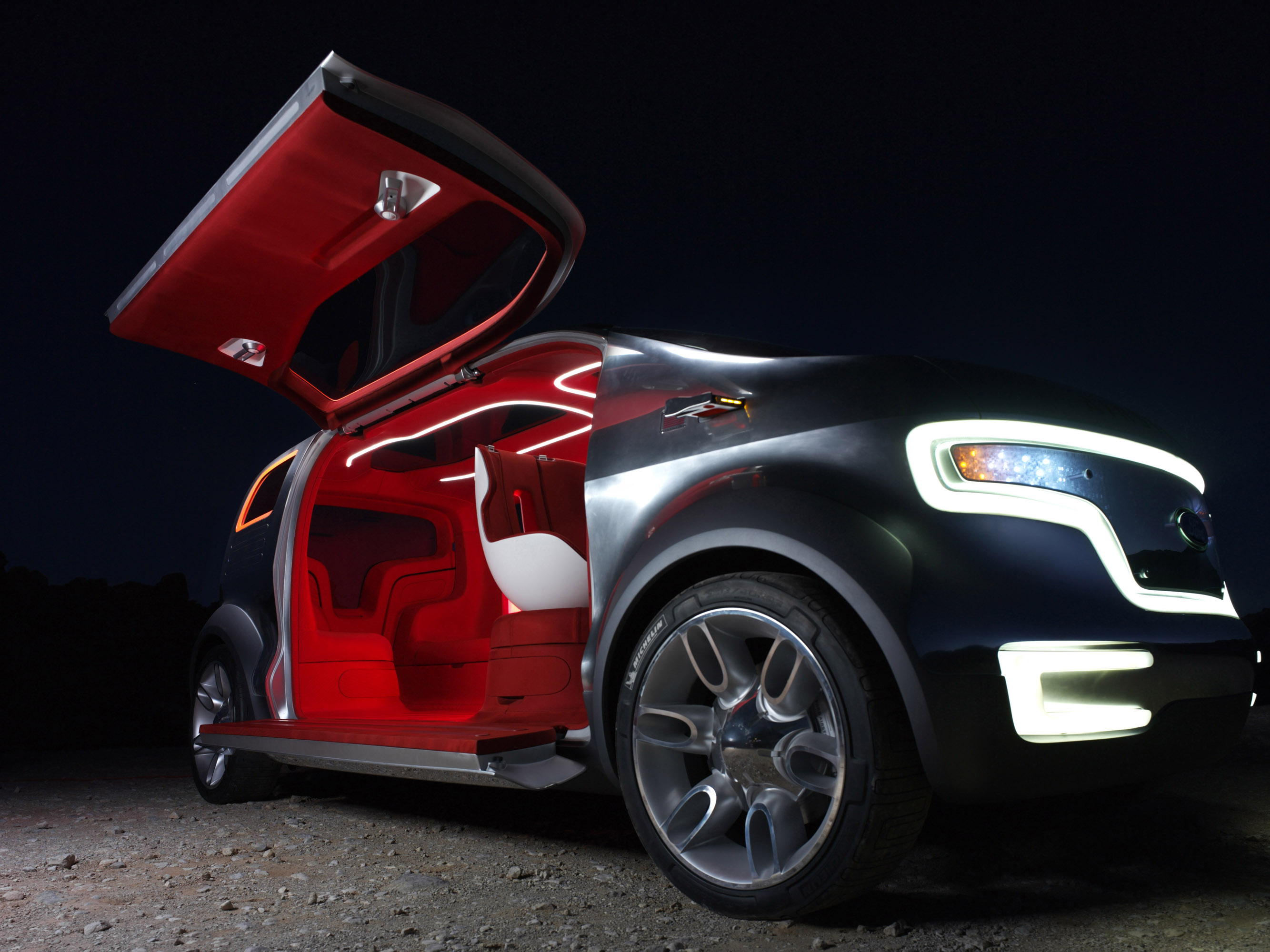 Its doors are asymmetric as well, allowing for easy loading of passengers and cargo. In addition to the driver's side hatch, the passenger side features a power clamshell door that runs two-thirds the length of the vehicle. A three-door hatch finishes the rear of the crossover.
