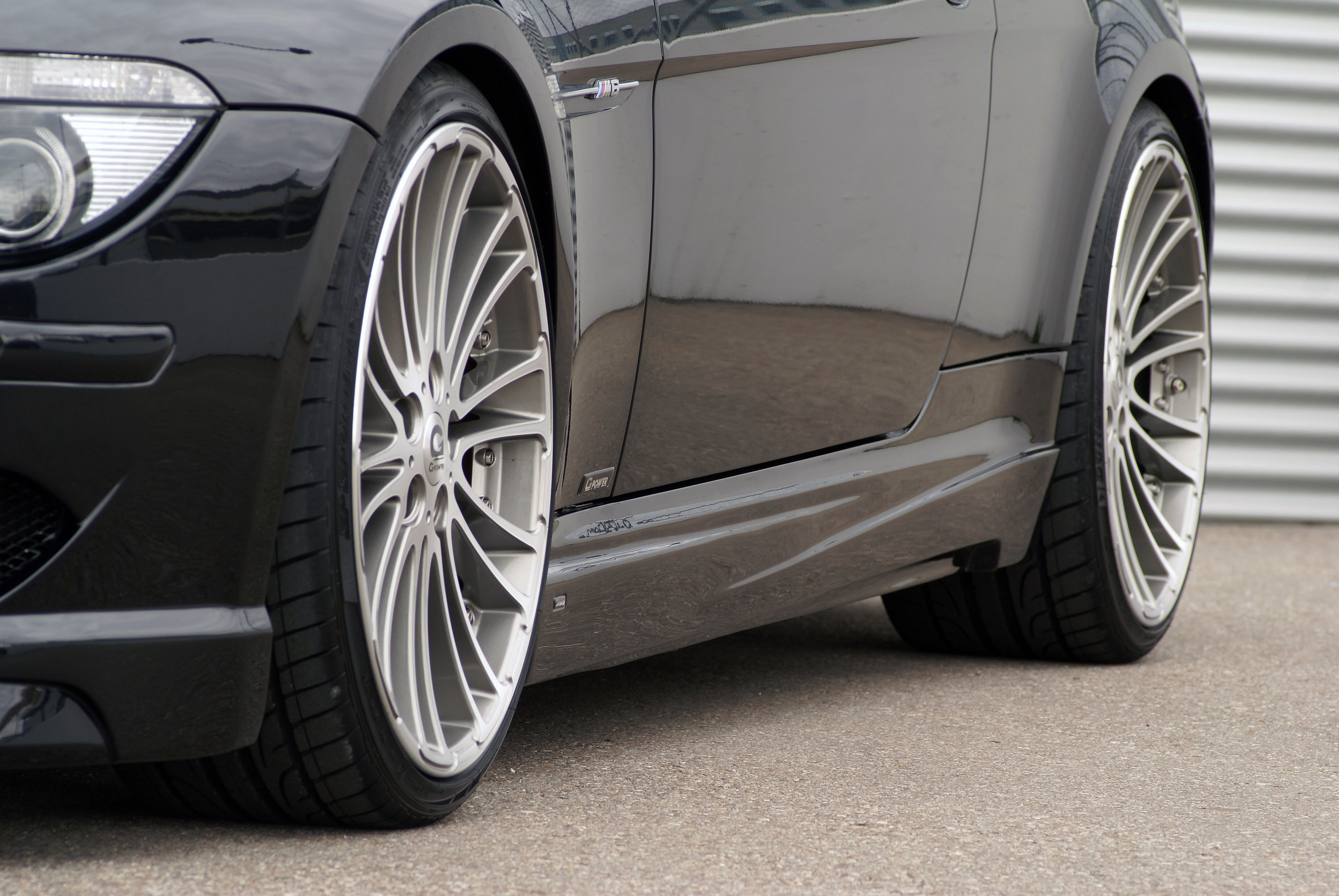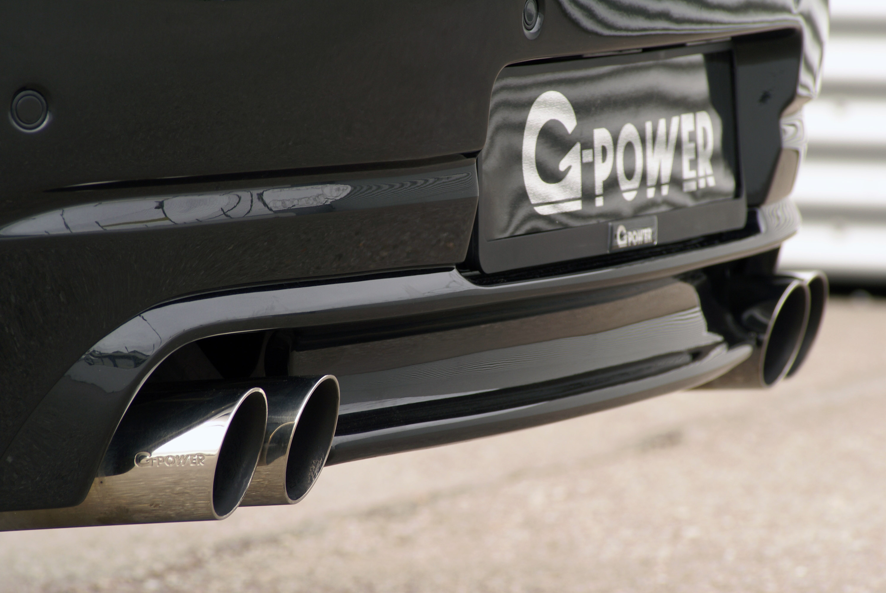 The G-POWER front apron, upon request also available made from especially light carbon fiber, replaces the production part in its entirety. Its large air inlets provide optimal supply of cooling air for all radiators and front brakes. At the same time the spoiler minimizes lift on the front axle at high speeds. The G-POWER rocker panels smooth the airflow between the wheel houses and give the M6 a longer, lower and sleeker appearance. Lift on the rear axle is reduced by the carbon-fiber rear diffuser for the G-POWER rear apron.
