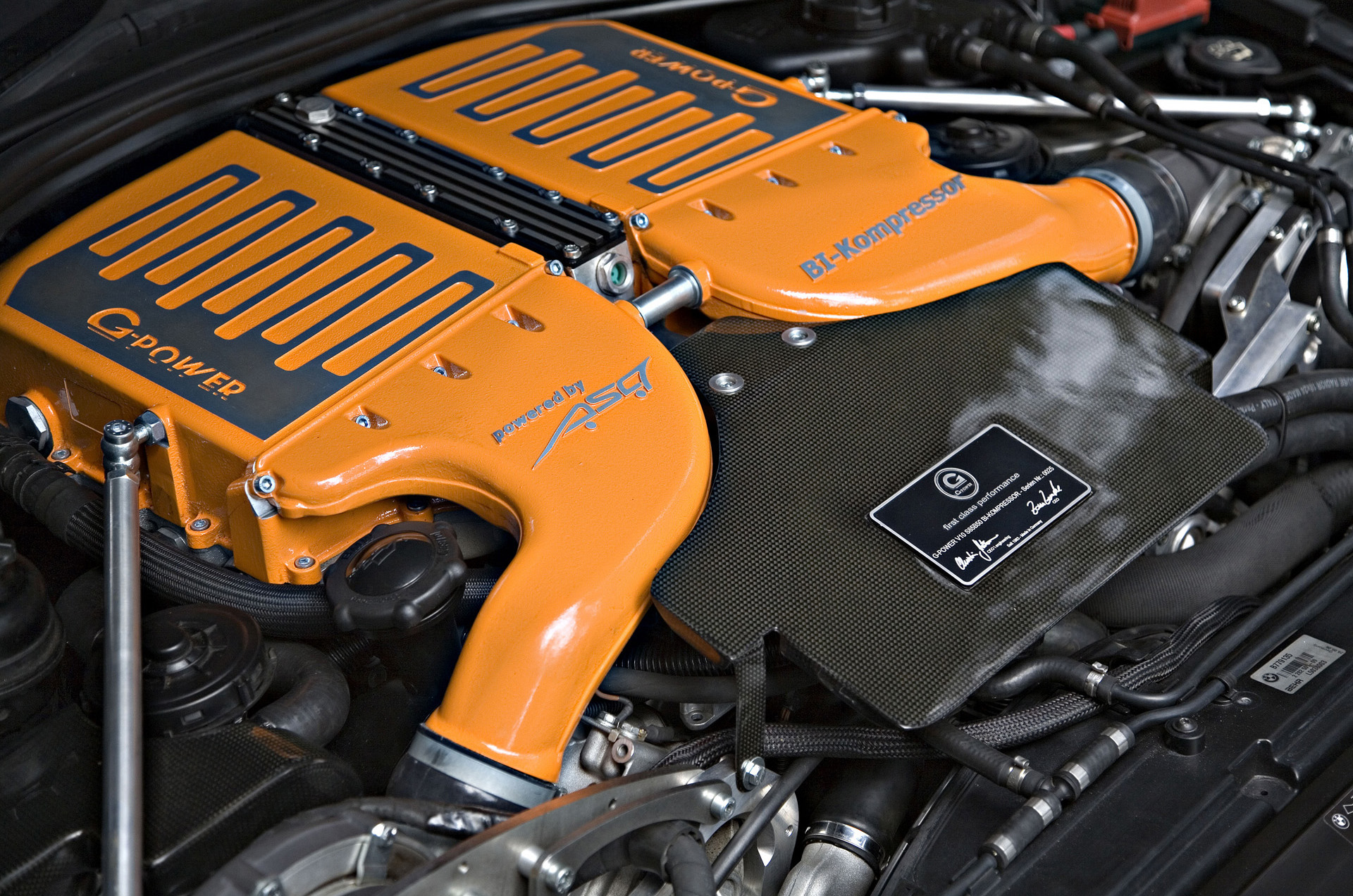 The necessary power increase comes courtesy of a further developed version of the 750 hp / 551 kW SK III RS bi-supercharger system, with the 800 hp evolution featuring two ASA T1-316 radial supercharger. The charge air, which is pre-compressed inside the two superchargers, is cooled to performance-enhancing temperatures by the dual-flow, water-cooled charge air cooler system finished in G-POWER's characteristic orange. This complex aluminium casting replaces the standard-production airbox on top of the engine and, because of its short intake channels, facilitates the same spontaneous throttle response as the series production engine, combined, however, with a substantial increase in torque.