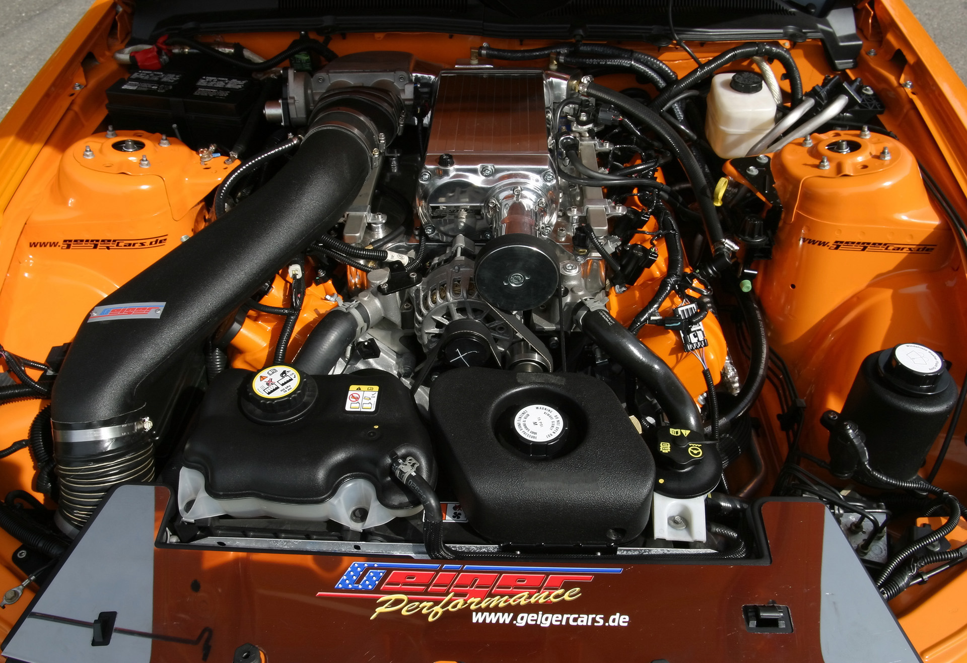 More power through more displacement and supercharge the whole thing to boot is the recipe behind GeigerCars.de's performance tuning of the Mustang GT V8 engine. Displacement was increased from 4.6 to 5.2 liters, and the engine was extensively reworked. Precision-machining of both cylinder heads, installing sport camshafts and reinforcing the valvetrain are part of the GeigerCars.de power treatment as is a belt-driven supercharger with generously dimensioned intercooler. A fully stainless-steel high-performance sport exhaust system with high-performance manifold and metal catalysts round out the engine conversion.