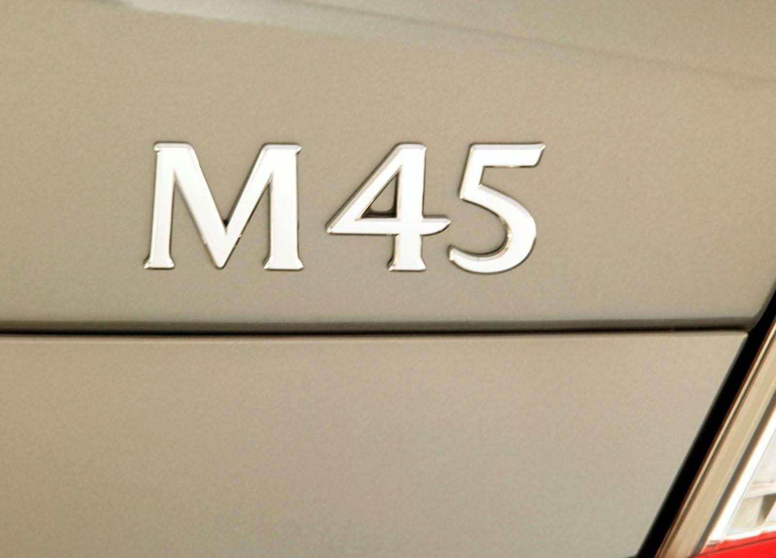 The new Infiniti M is available with a choice of V8 or V6 engines, with the vehicles designated M45 and M35 respectively. The M45 features a powerful DOHC 4.5-liter V8, shared with the flagship Infiniti Q45 and FX45. It is rated at 335 horsepower and 340 lb-ft of torque. The M35 utilizes an advanced DOHC 3.5-liter V6 rated at 280 horsepower and 270 lb-ft of torque. The V6 is part of the award-winning VQ engine series also found in the G35 and FX35.