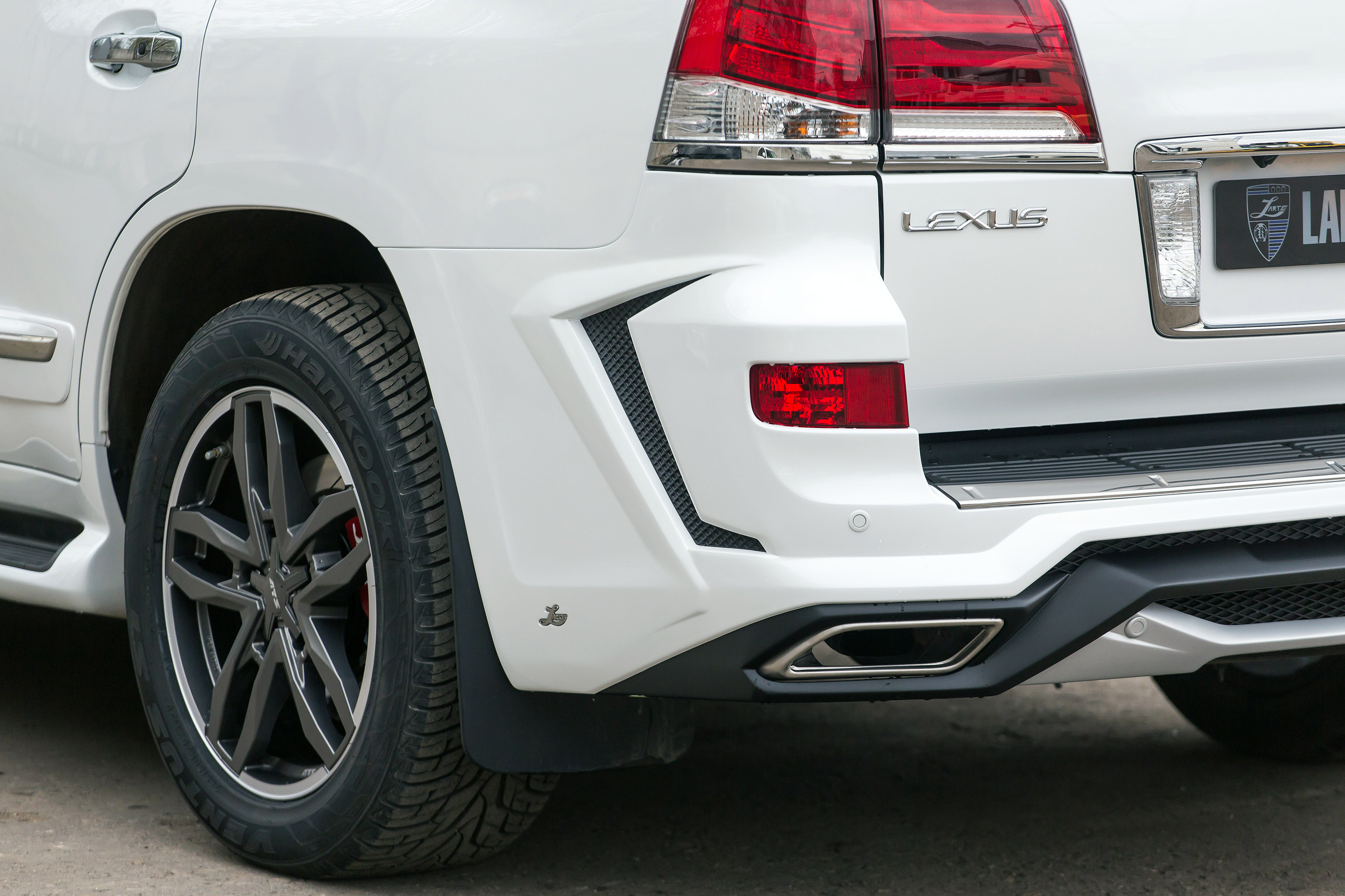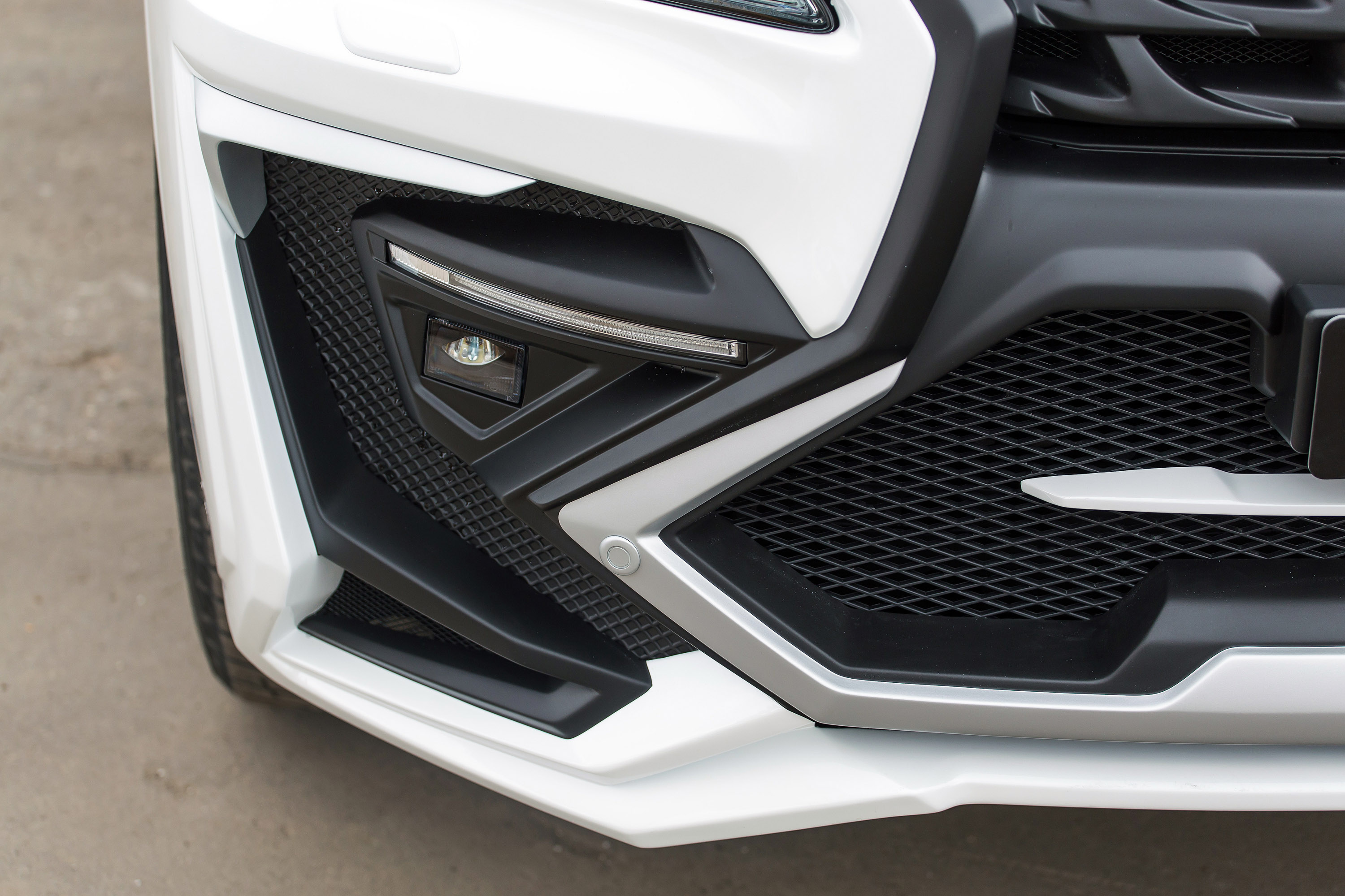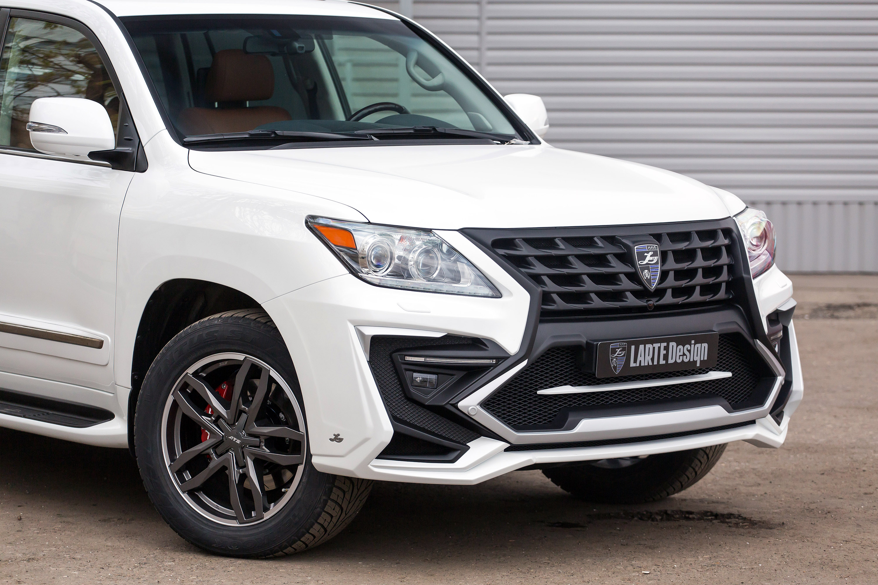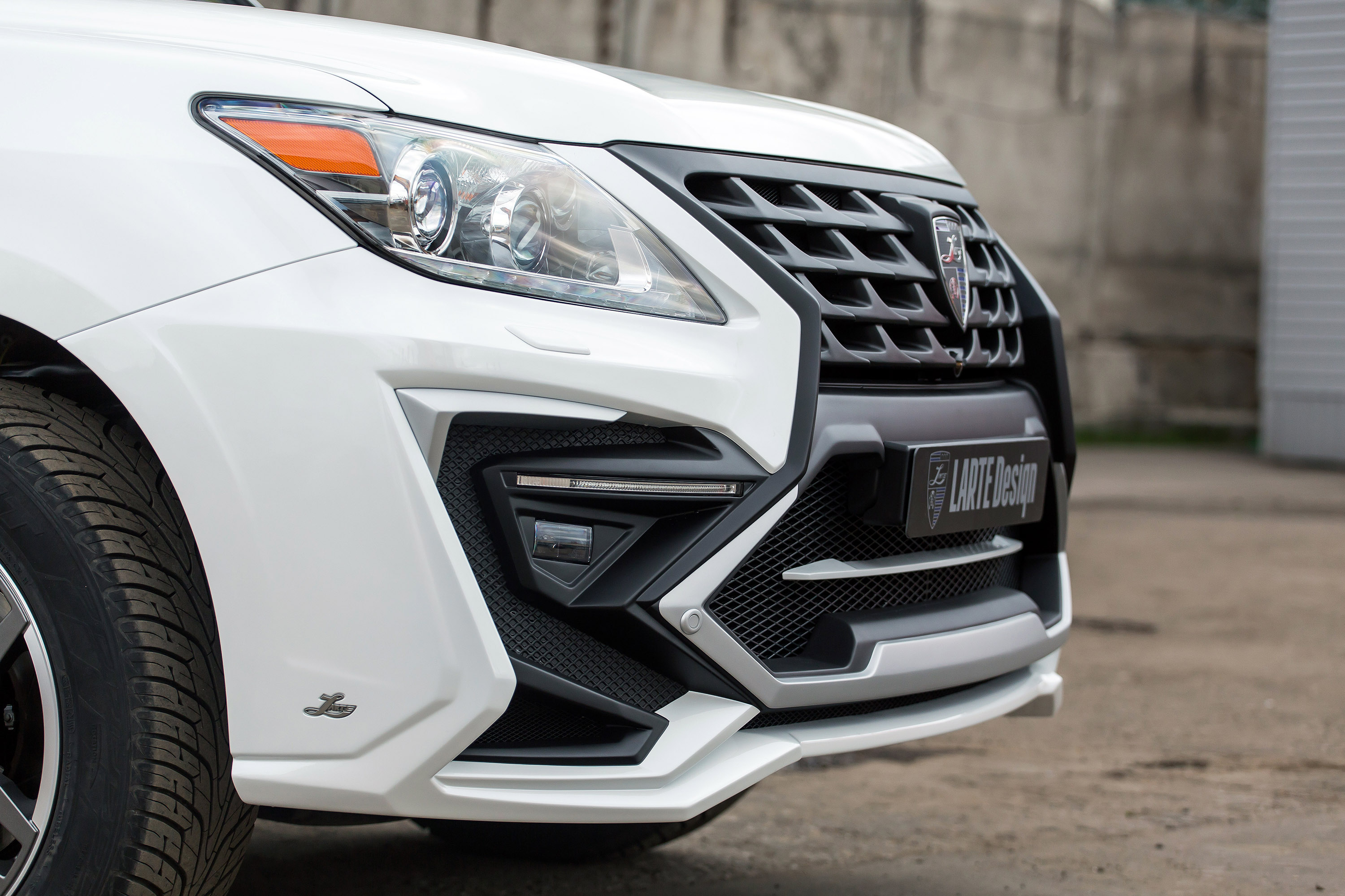 Premium tuner LARTE Design has turned the full-size SUV into a much aggressive car, using a complex body kit made of high-quality fiber-glass. Under the black radiator grille a huge silver brace makes for a predator-like appearance. Then we have the LED daytime running lights specially manufactured by the German supplier Nolden. The ragged front is also adorned by irregular edges, protrusions, slants and elements and huge air inlets bearing grids.
