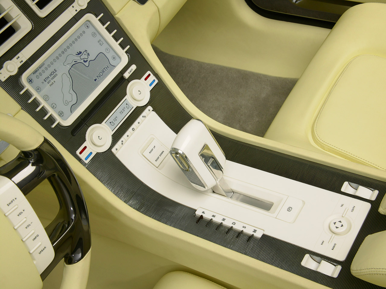 The instrument panel integrates a softly illuminated, jewel-like instrument cluster that combines analog with digital technology. A solid flowing center console constructed of ribbed dark chrome separates driver and passenger, unites the interior with the exterior and conceals a storage unit in the rear bulk head. A laser-inscribed "Lincoln Mark X" vanity plate above the glove box suggests an air of luxury.