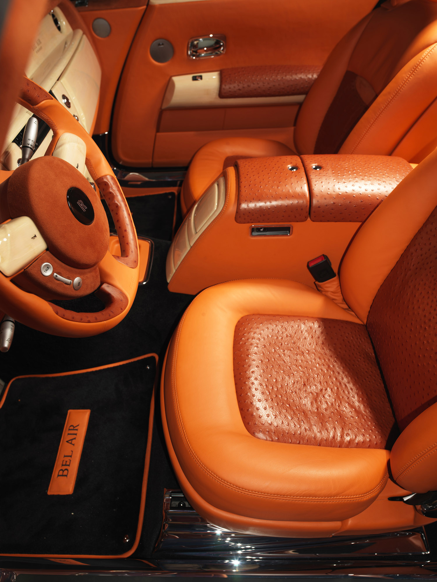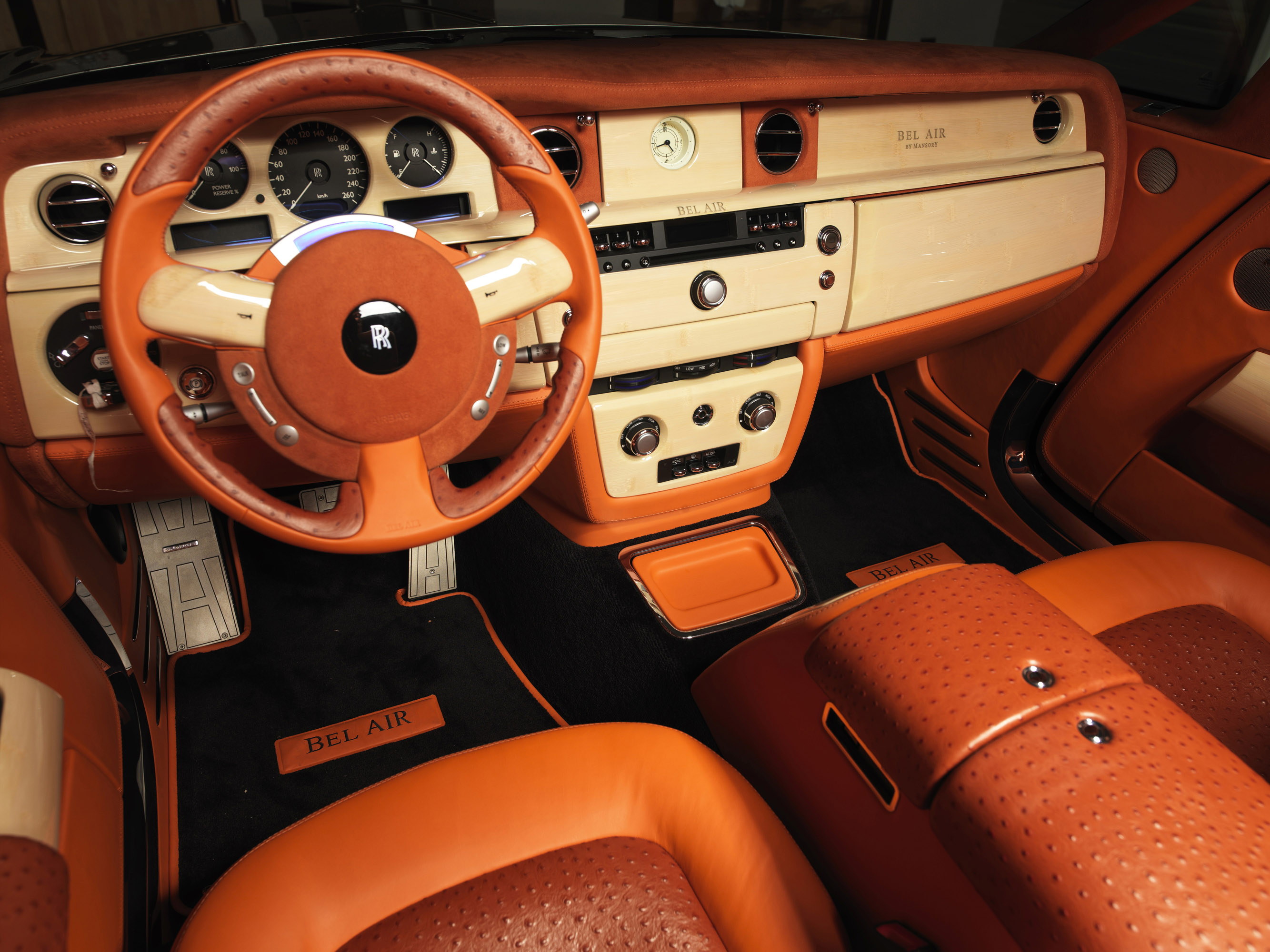 The stylish interior of the MANSORY is created using only the most sophisticated materials. Extravagant design products such as the extremely soft design leather with its characteristic grain ensure a sense of comfort and exceptional flair. Matching with this are the expertly crafted carbon and natural wood appointments in the interior. Perfectly diamond-stitched decorative seams on the dashboard and seats add further visual accents. The aluminium pedals, the illuminated door sill trims and the new ergonomically designed airbag steering wheel go to complete the strikingly beautiful overall appearance of the MANSORY Bel Air. Whether you are sitting in the front or in the back of this high-class convertible – motoring can not get any more luxurious than this.
