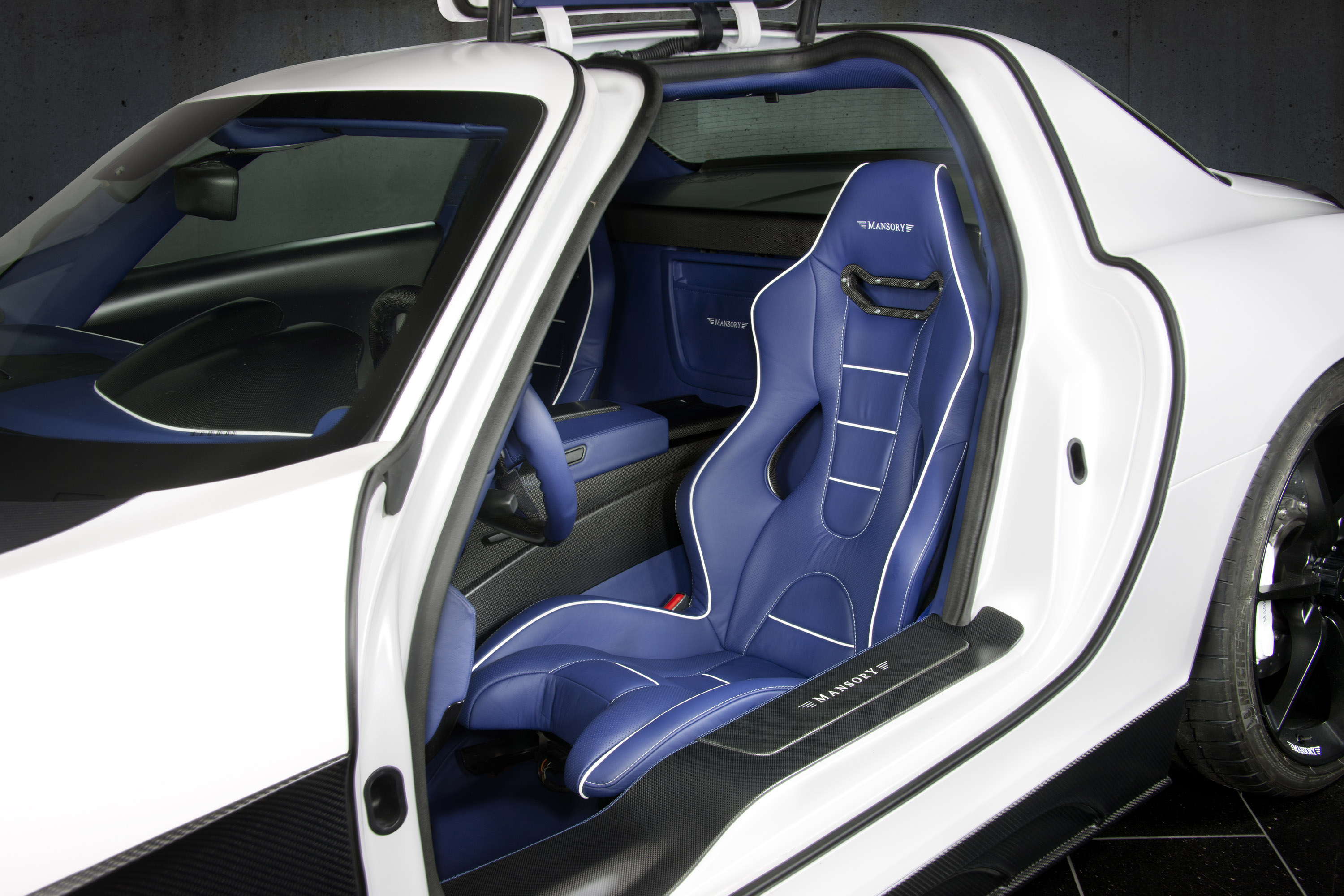 As usual, MANSORY turns the interior into a highly functional control centre with quality and innovative design that is second to none. Only the finest materials find their way into the car's interior, ensuring the greatest sense of comfort. Master craftsmen apply their skills using leather that is hard-wearing, yet exceptionally soft. The characteristic, natural product with its special grain and the perfect decorative stitching by the hands of a true professional convey a stylish elegance all around the newly designed airbag steering wheel. The aluminium pedal system and the real carbon applications complete the luxurious overall impression of the MANSORY Gullwing.