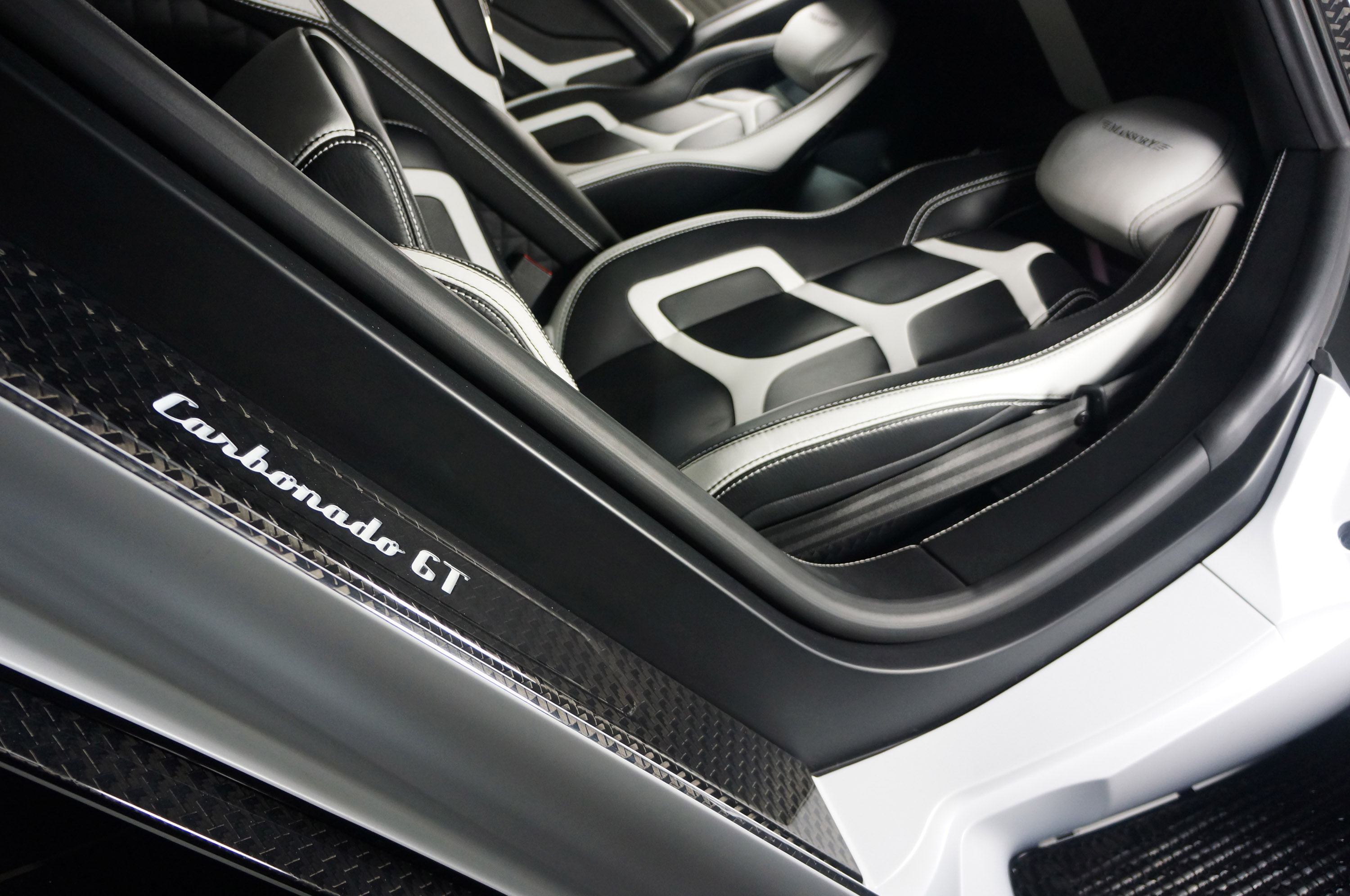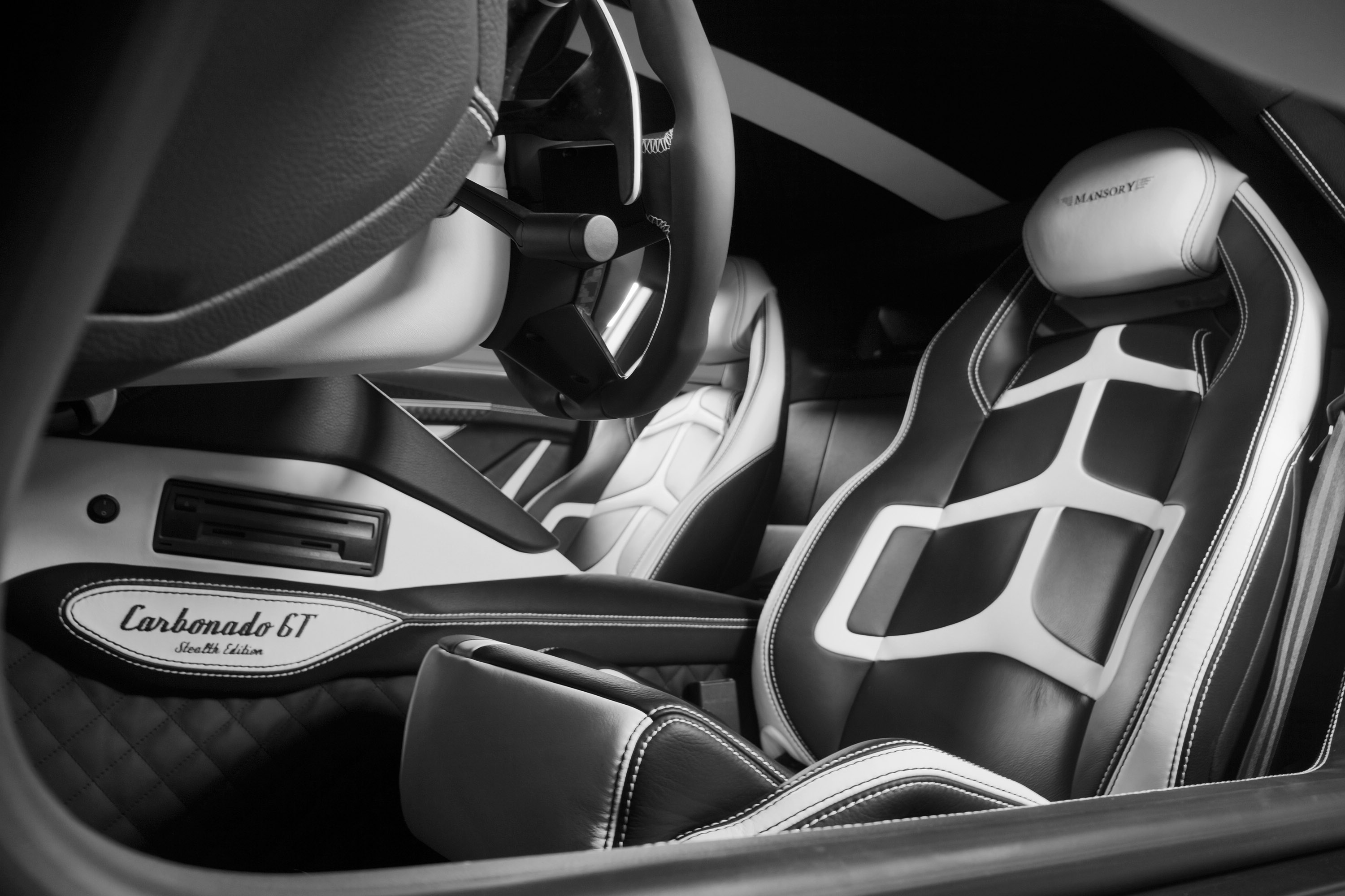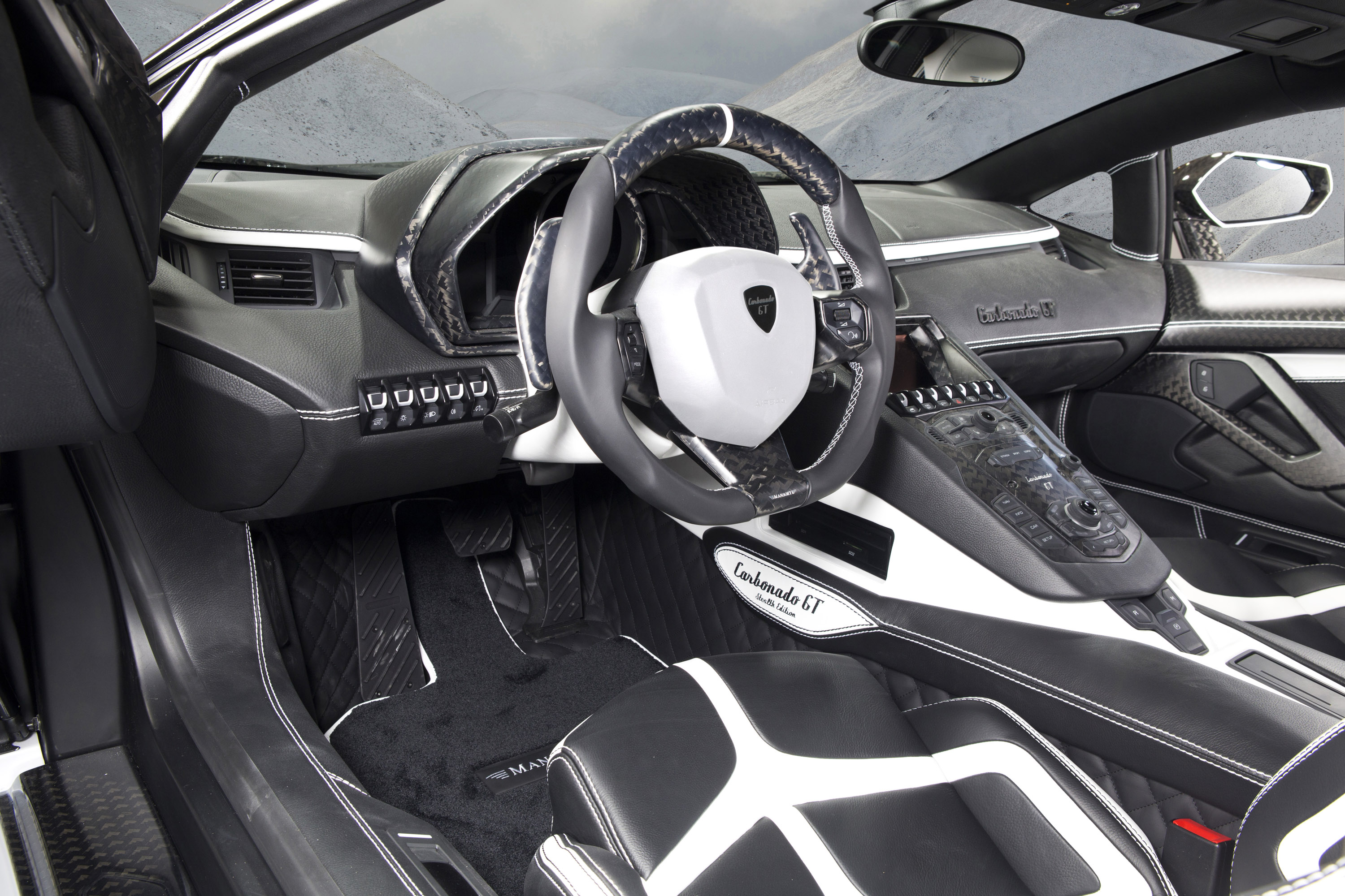 The Lamborghini refinement program finds a perfect fulfilment in the extensive interior applications. Naturally only the finest of materials are used. The processed leather used for the seats as well as the dashboard is particularly durable yet still extraordinarily soft. This characteristic natural product with its individual graining and the perfect hand stitching conveys an air of extravagant flair around the newly designed sports steering wheel with airbag. In order to accent the character of the CARBONADO GT interior even more non-slip aluminium pedals as well as genuine carbon fibre components are used on the doors, the fittings and the centre console. The newly positioned starter button presents one of the technical highlights of the interior. In the style of an aircraft cockpit switch MANSORY has relocated this red switch from the centre console to the roof lining.