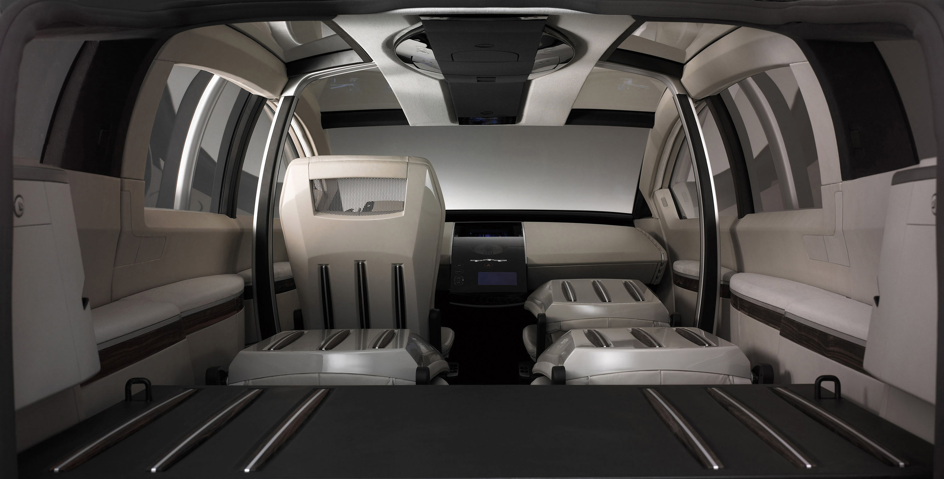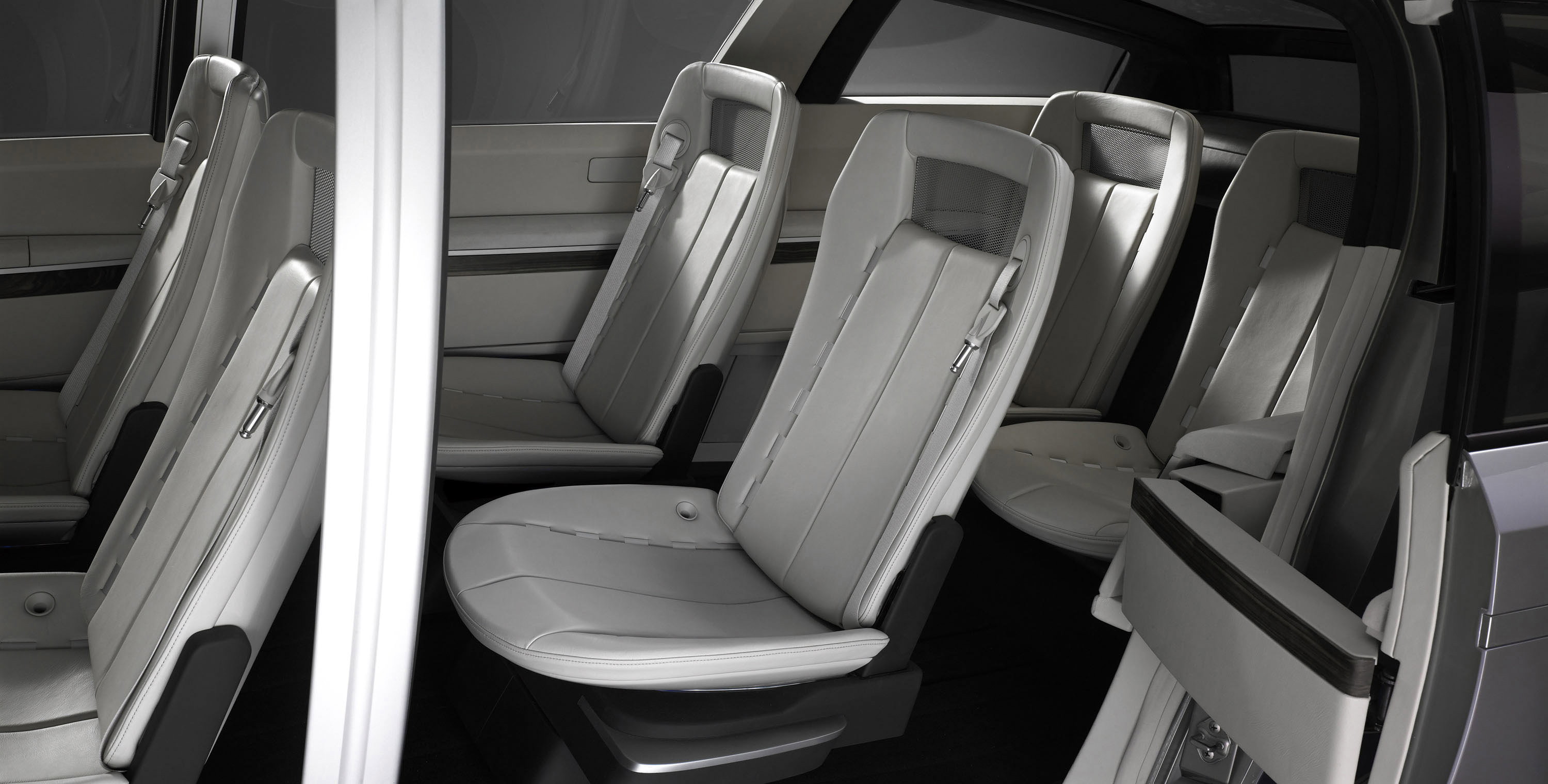 Central to the concept are the vehicle's doors, both front and rear. The front two doors, with unique forward hinging, open extremely wide to an angle of nearly 90 degrees – presenting the appearance of an eagle, soaring with outstretched wings. The rear sliding doors are also innovative, opening first outward and then sliding rearward much like the doors on a jet liner. Functional too, the doors, when ajar, present a large opening into the vehicle's roofline that greatly assists access to the rear seats. The doors are just one example of how the concept experiments with vehicle/passenger interaction.