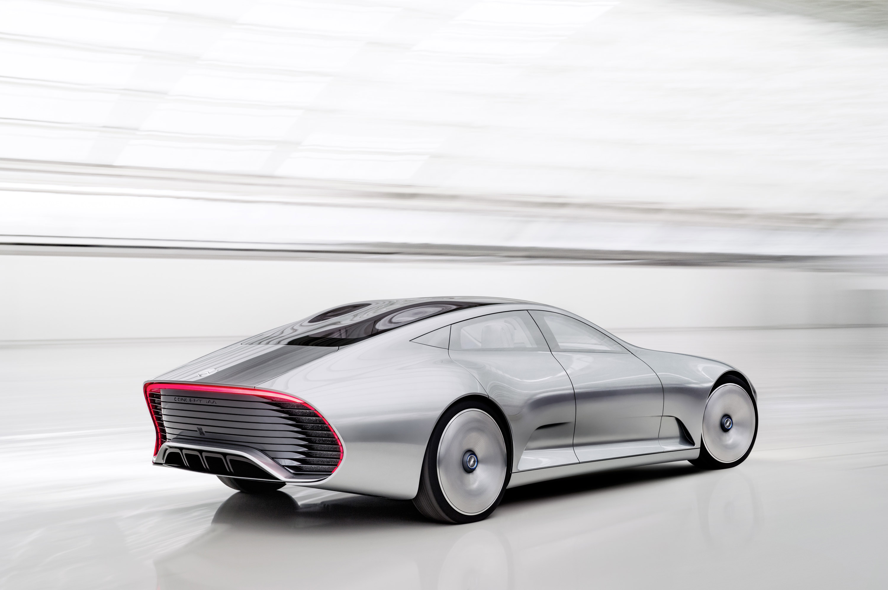 At the touch of a button, or automatically on reaching a speed of 80 km/h, the Mercedes-Benz "Concept IAA" (Intelligent Aerodynamic Automobile) performs a fascinating transformation in which the captivatingly beautiful four-door coupé turns into an aerodynamics world champion: eight segments extend at the rear, increasing its length by up to 390 millimetres; front flaps in the front bumper extend by 25 mm to the front and 20 mm to the rear, improving the air flow around the front end and the front wheel arches; the Active Rims alter their cupping from 55 mm to zero; and the louvre in the front bumper moves 60 mm to the rear, improving the underbody air flow.