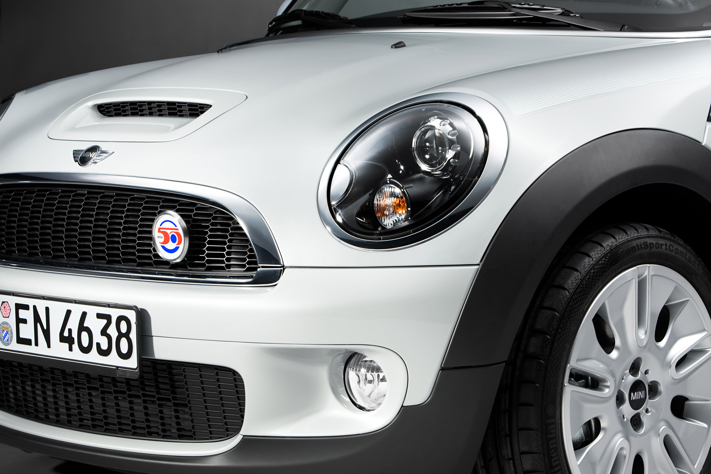 The side indicator frames house the Union Jack in black-and-white and the "Camden" model designation forming the logo of this special anniversary model also to be admired, together with the designation "MINI 50", on the door entry trim.