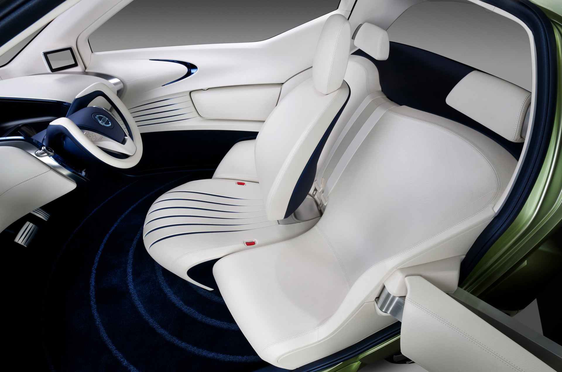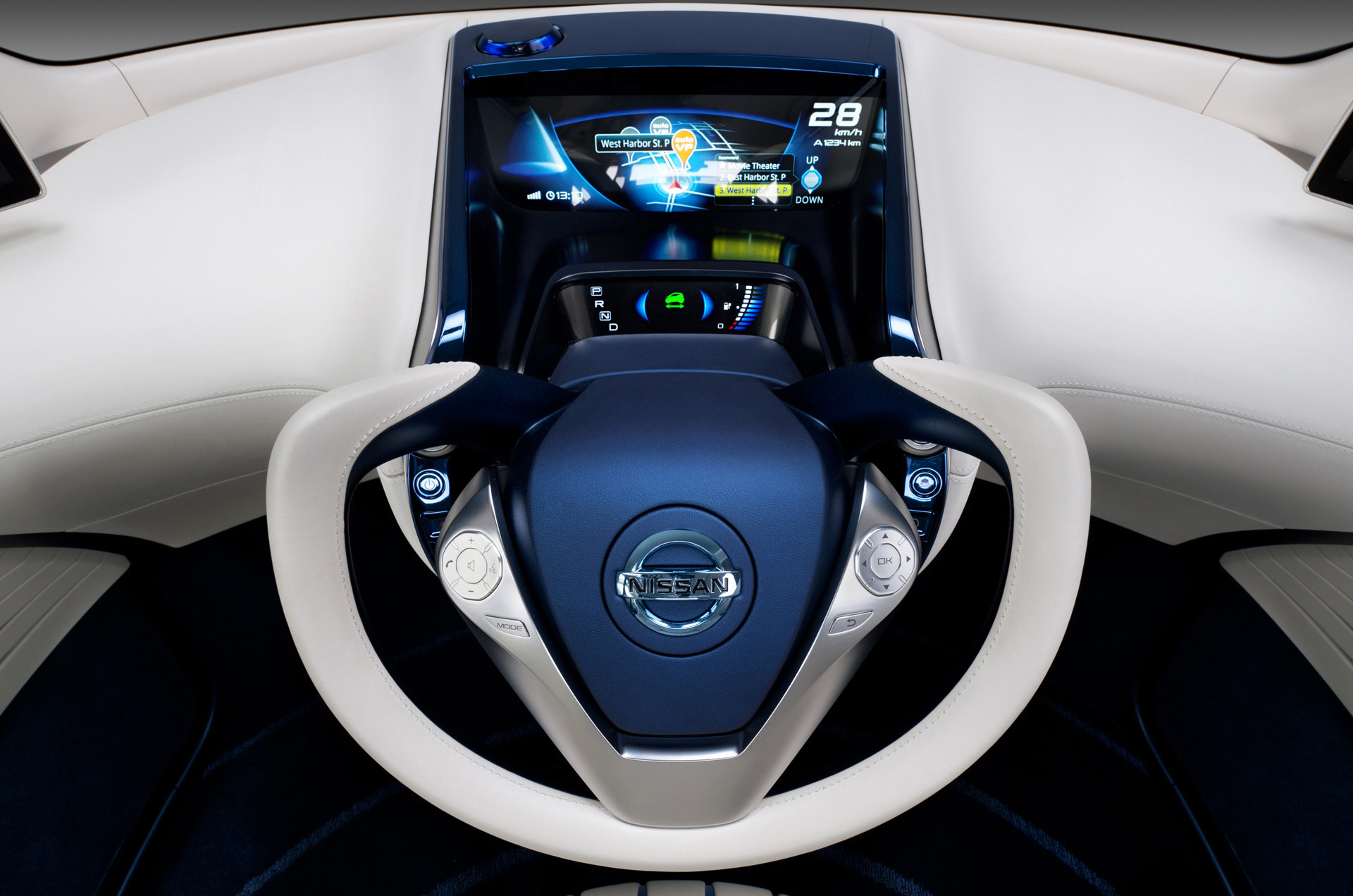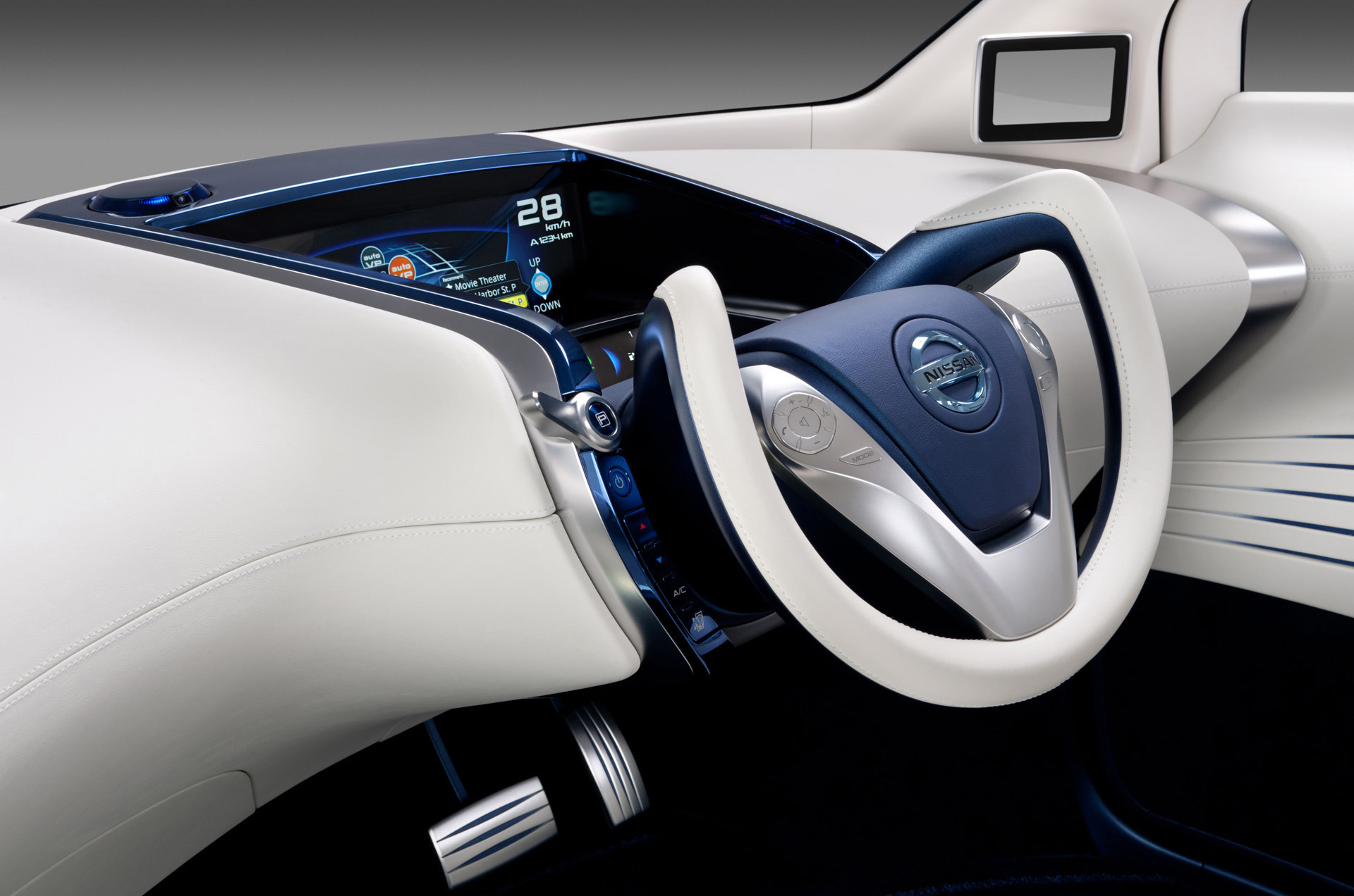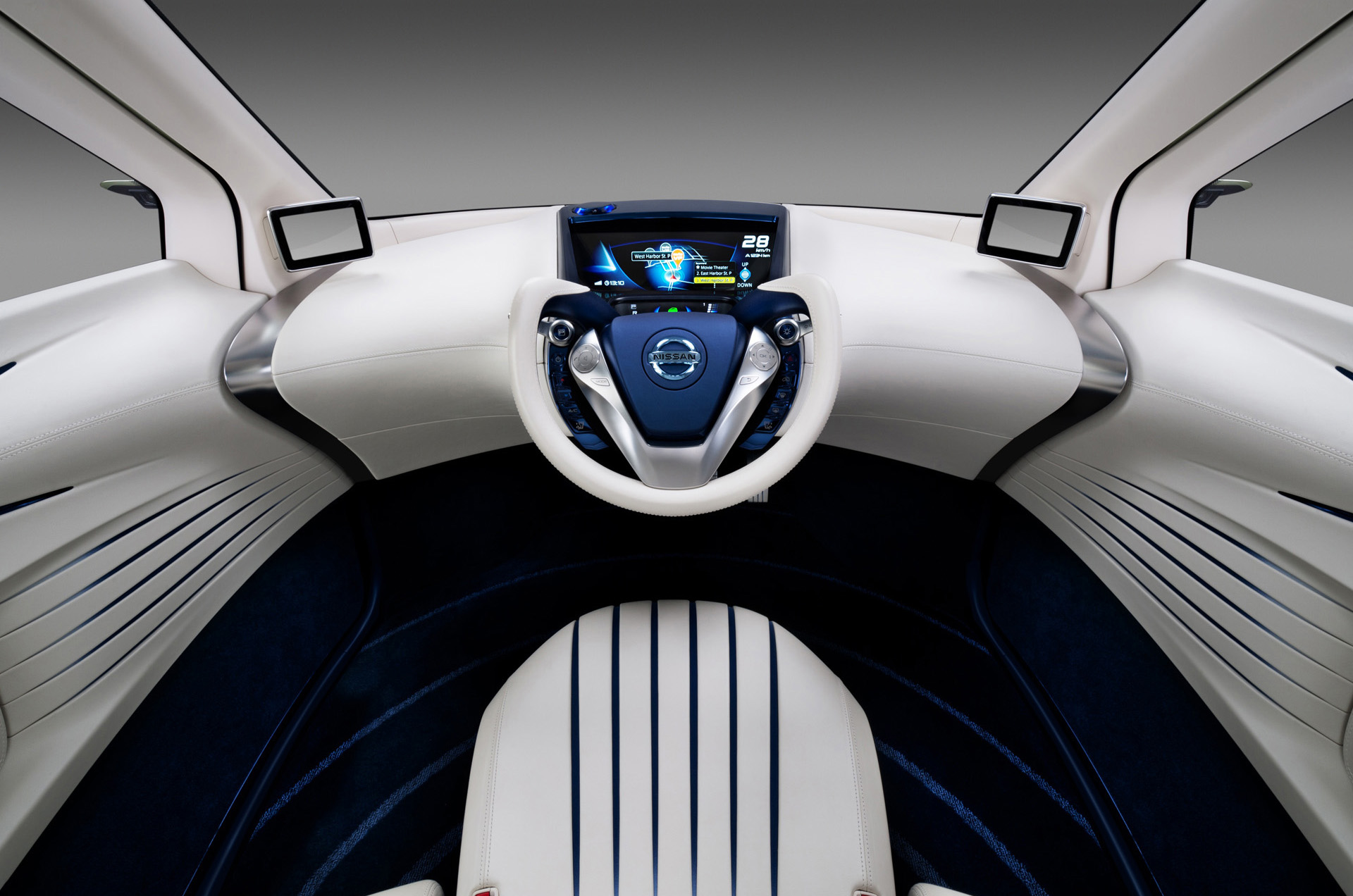Inside, PIVO 3 presents a distinctive design centering on driving controls that seamlessly integrate with interior and exterior styling. Side-view monitors take the place of mirrors, using Nissan's Around View Monitor system to reveal the car's surroundings and help minimize blind spots. The center console features an ultra-wide display for GPS and other information, and together with a sub-monitor and the Robotic Agent, is positioned to interact discreetly with the driver. Carefully stitched leather and silver-hued trim meld in a "snow white" and "EV blue" color scheme to produce a tasteful, high-quality ambience. Smooth surfaces add to the refined feel within the compact cabin dimensions, rather than emphasizing environmental frugality.