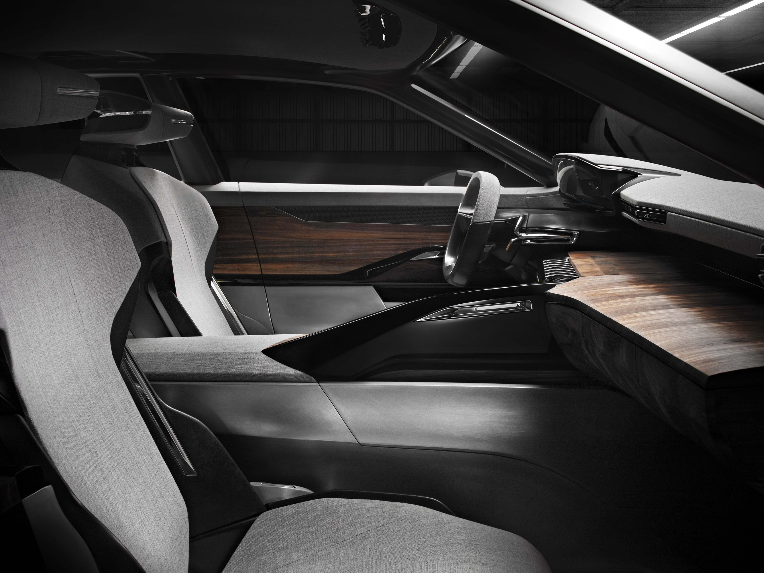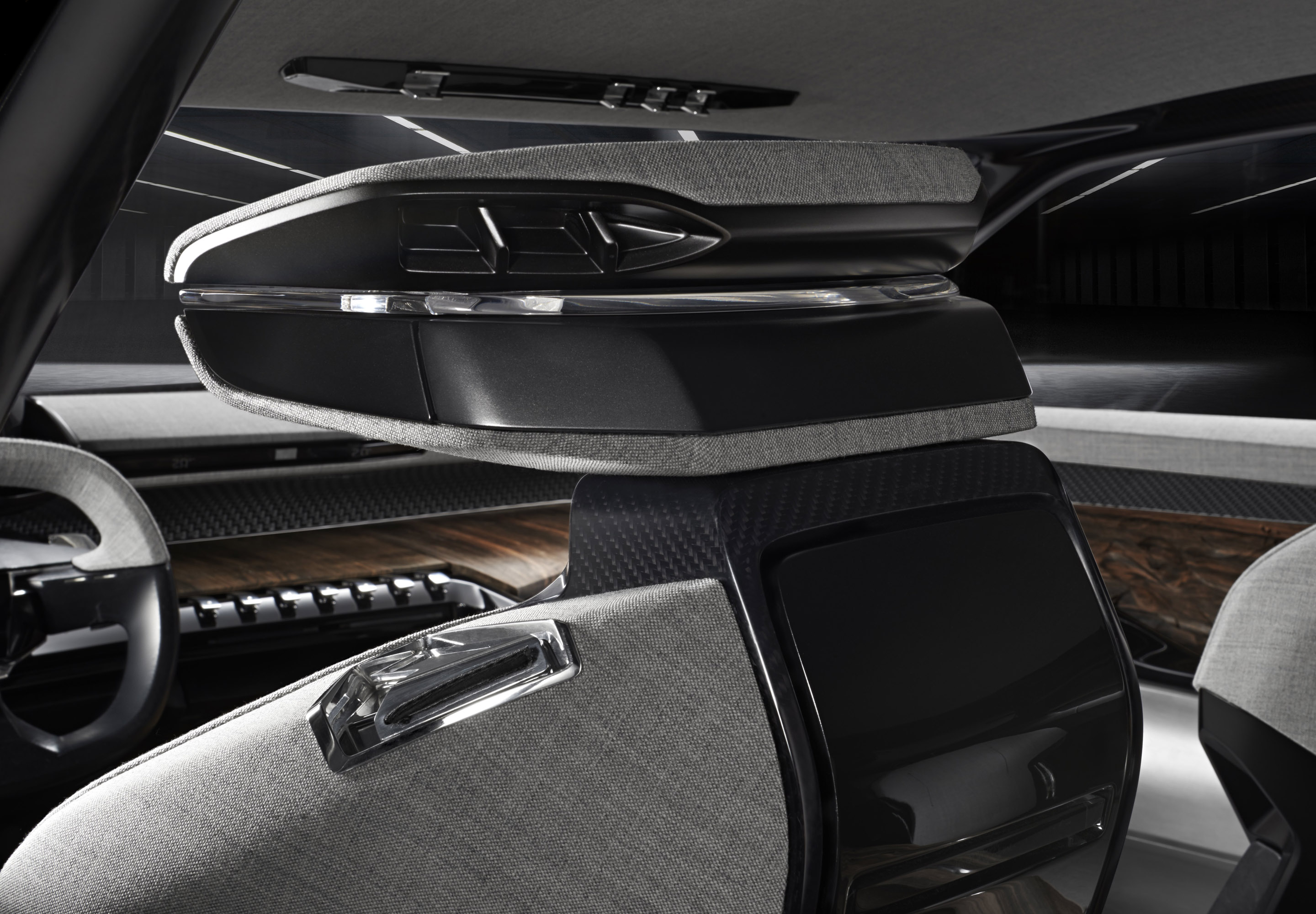 Steel remains bare in all areas where it does not come into contact with the bodies of the four occupants. At the elbows and arm contact points, EXALT is trimmed in warm toned wood. From the bottom of the windows, it gives way to a natural wool-based ‘chiné' mixed fabric used to trim the door panels, the dashboard and the interior roof. Between these two materials, a strip made by 3D printing conceals the speakers of the Hi-Fi system. Its structure draws inspiration from anechoic chambers where the dihedral partitions reduce acoustic interference.