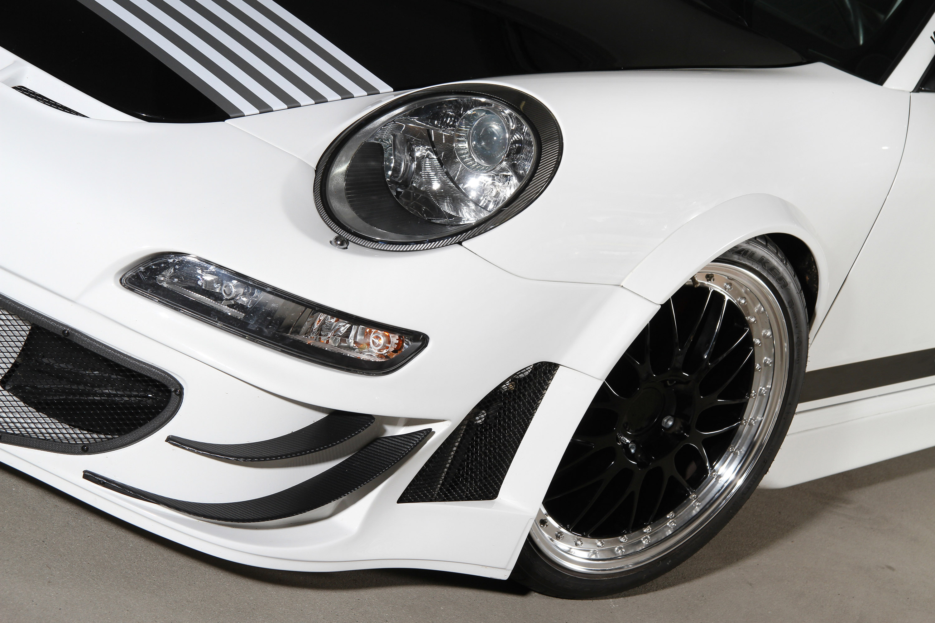 The wide body kit emerged in domestic production and transformes every 911 (con-struction series 997 until the construction year end of 2006) into a real unique copy of the racing sports looks. A completely new bumper bar with massive ventilation shafts and side cup-wings made of carbon fiber thus account for a perfect racing sports optics. Ingo Noak fitted the 997 with a massively wider status through the enlarge-ment of the front fender and the rear wheel housing. The front and the rear are joined together by a specially developed side skirt. The rear appears brawny and endlessly broad thanks to a completely new rear bumper bar with side ventilation openings, a cup flap, and a big rear wing including air-ram engine cover. The highlight on the rear is surely the centrally positioned space for the sports exhaust system made of stain-less steel with its two end-pipes of 90-millimeter diameter. The end-pipes were posi-tioned to look like a diagonally-laid muffler has been installed.
