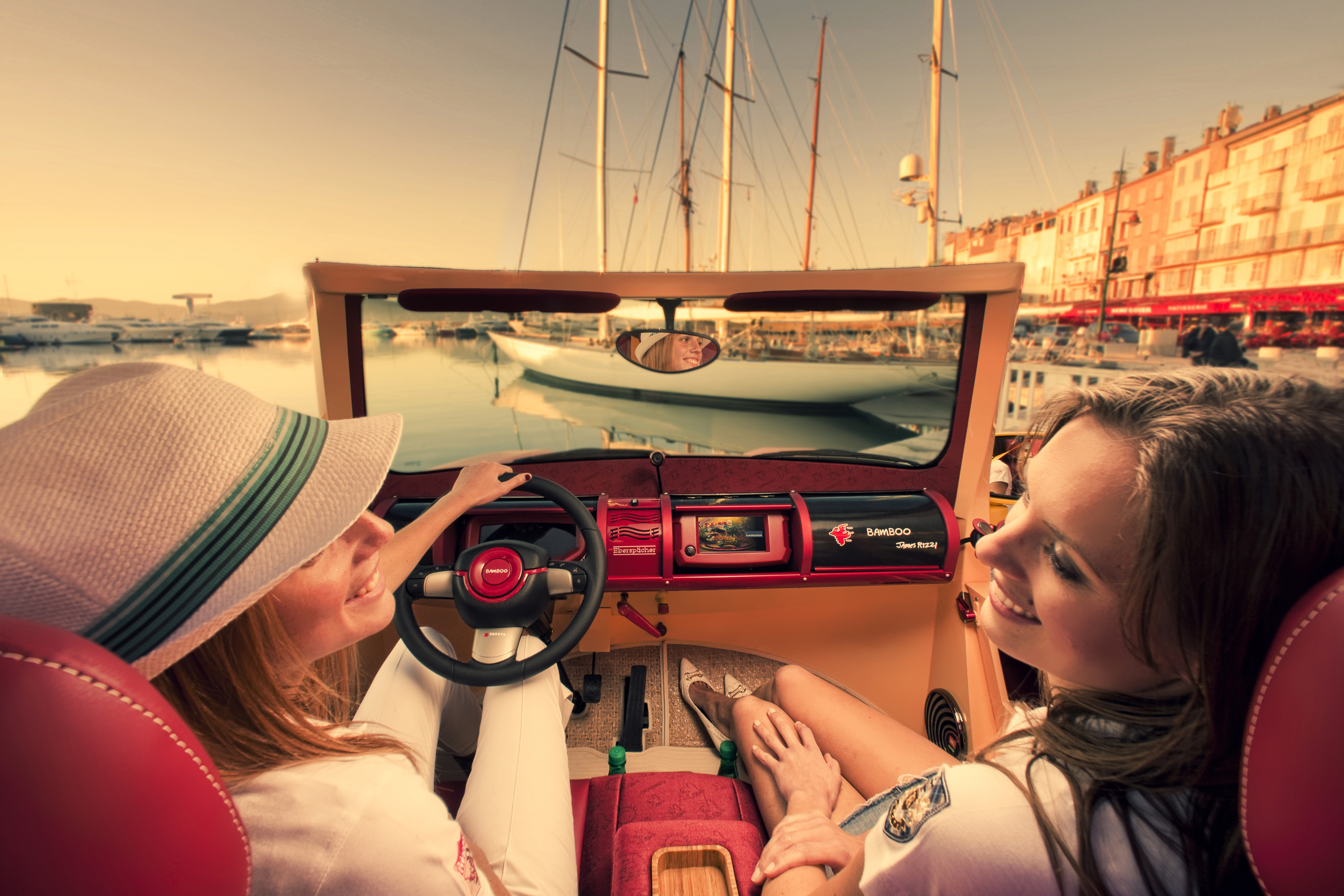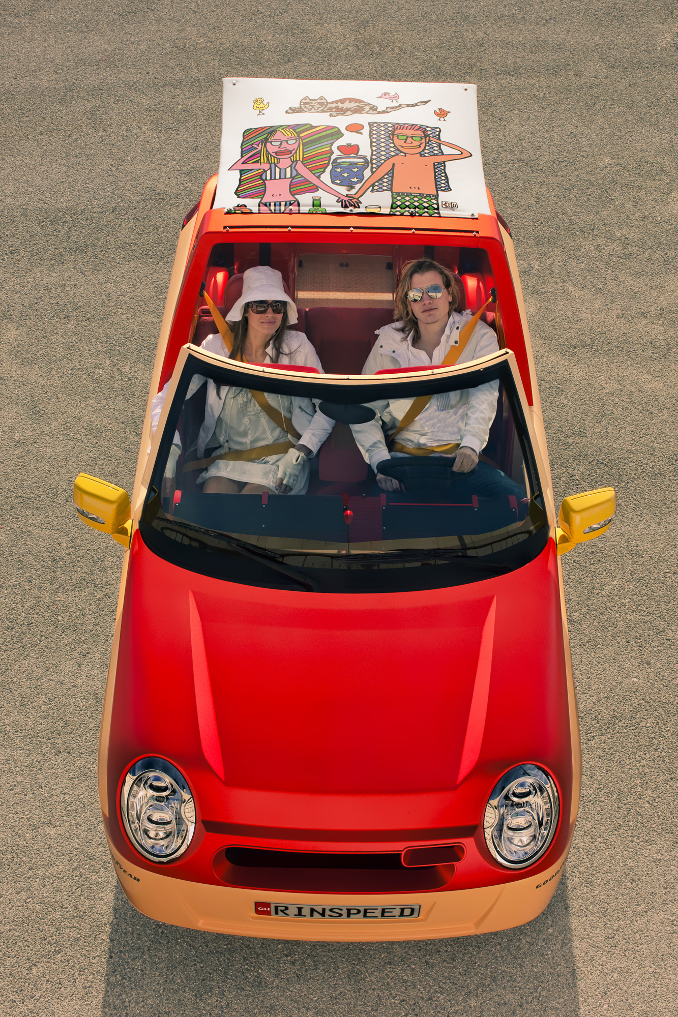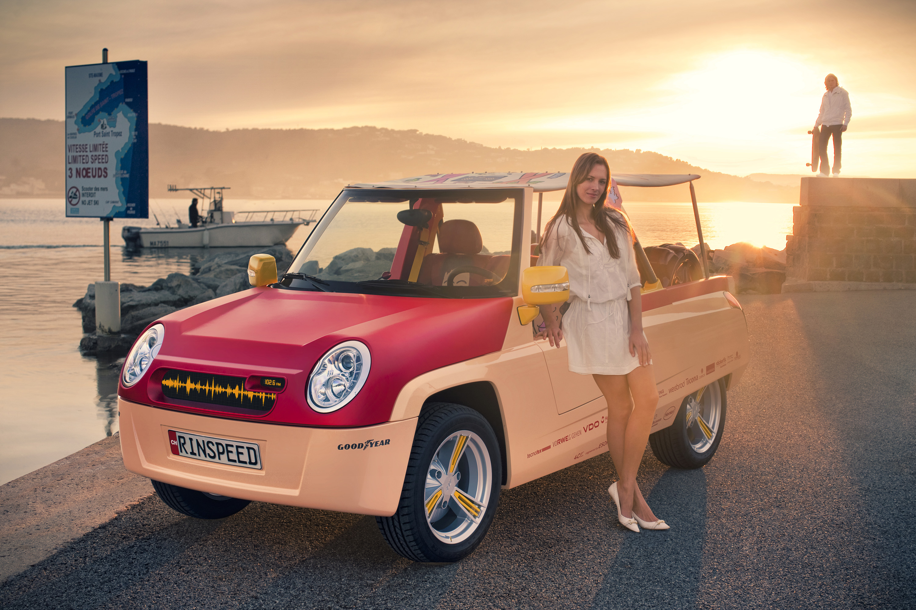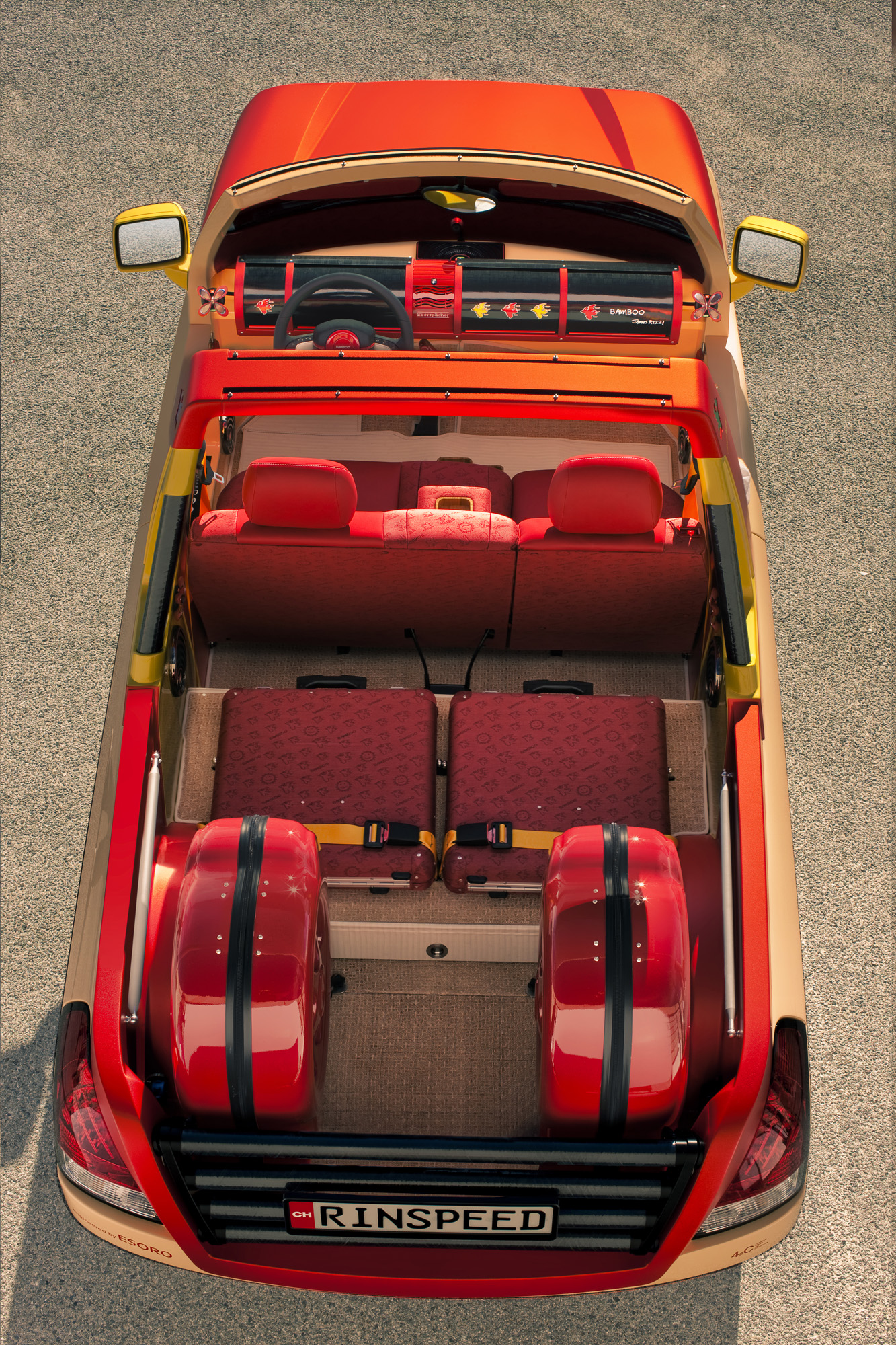 Open Speedster for the Extroverted Communicator - Seamless High-Tech, Purism and Lifestyle This car irritates. Could be that it's the ingenious crafted creations of world-renowned New York pop artist James Rizzi. In any case, Frank M. Rinderknecht‘s latest work "BamBoo" lets the sun rise over the over-engineered metal creatures at the Geneva Motor Show, whose single purpose is to never touch anything other than black asphalt. Yes, this is a taste of summer. A taste of beach and sand, of the lightness and lightheartedness of southern latitudes. It is a reminiscence of the Seventies, of the south of France, of St. Tropez. Its colors range from salmon to lobster and yellow, shimmering in the sunlight, staged perfectly by color- and adhesive-repair-specialist ("StickerFix") AkzoNobel. And one would expect to find Brigitte Bardot behind the wheel with playboy Gunther Sachs at her side heading towards Tahiti beach. But at the same time this car points to the future with clever innovations such as a communication display in place of a radiator grille and an inflatable roof that also serves as a beach blanket. Yes, this sun & fun car will blow the roof off!