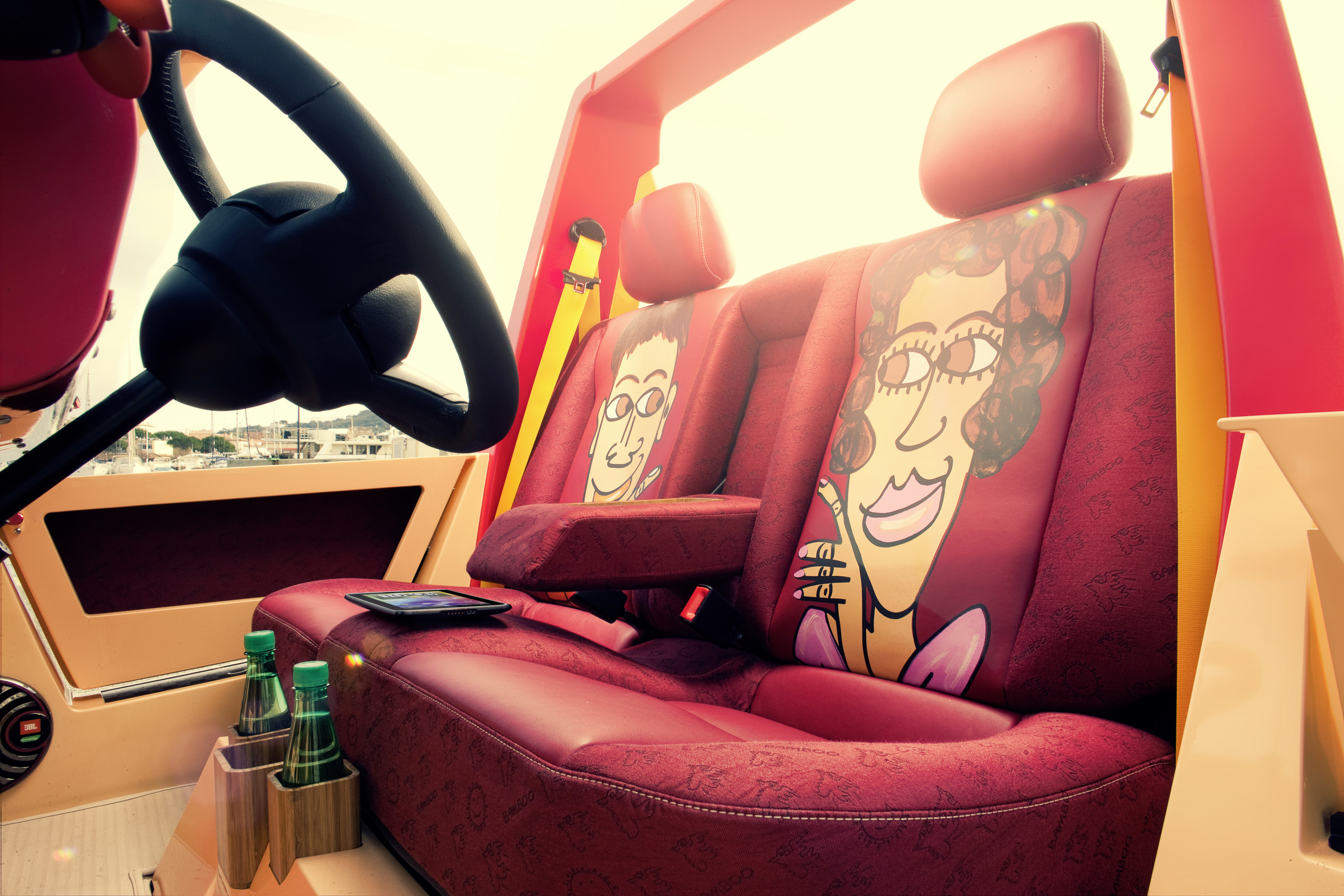 Simple but highly refined is the interior of the "BamBoo." It's all in a name: The sides of the Bordeaux-red bench are decorated with the "BamBoo" logo and the "Rizzi bird," artfully woven with bamboo thread by Zurich weaver Weisbrod. The center seating surfaces are decorated with Rizzi drawings, and are made from breathable high performance synthetik "Laif" material. And both rear seats are inflatable and stored in two aluminum cases on the open cargo bed. You guessed it – they too can be taken to the beach.