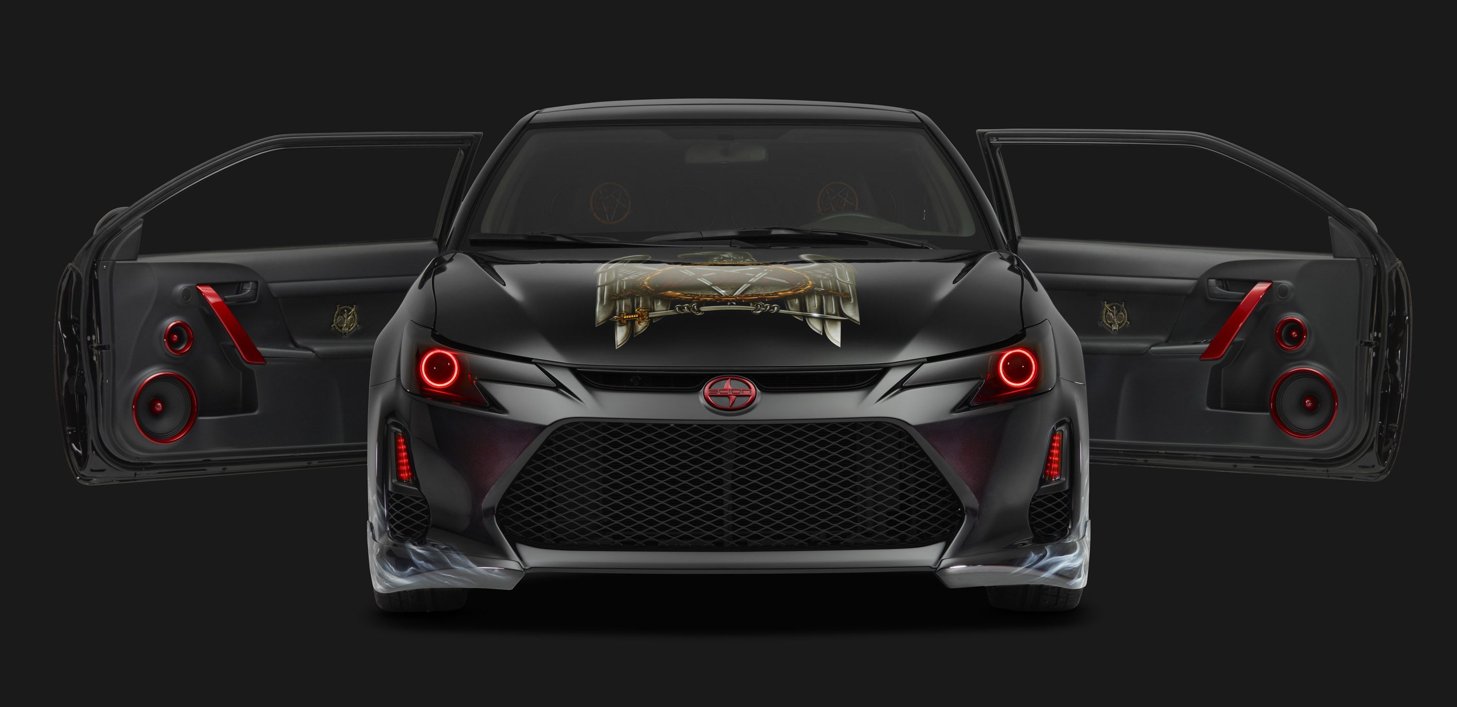 Mike Vu of MV DESIGNZ translated the look and sound of thrash metal band Slayer into the Scion tC. The "Scion x Slayer Mobile Amp tC" will fascinate fans with a custom paint job with airbrushed logos and skulls, suicide doors and Billet Slayer sword blade wheels with spike-style center caps. The interior turns up the volume even higher with a custom Pioneer audio system with towers of speakers, a custom mixer and a 32-inch monitor for media playback.
