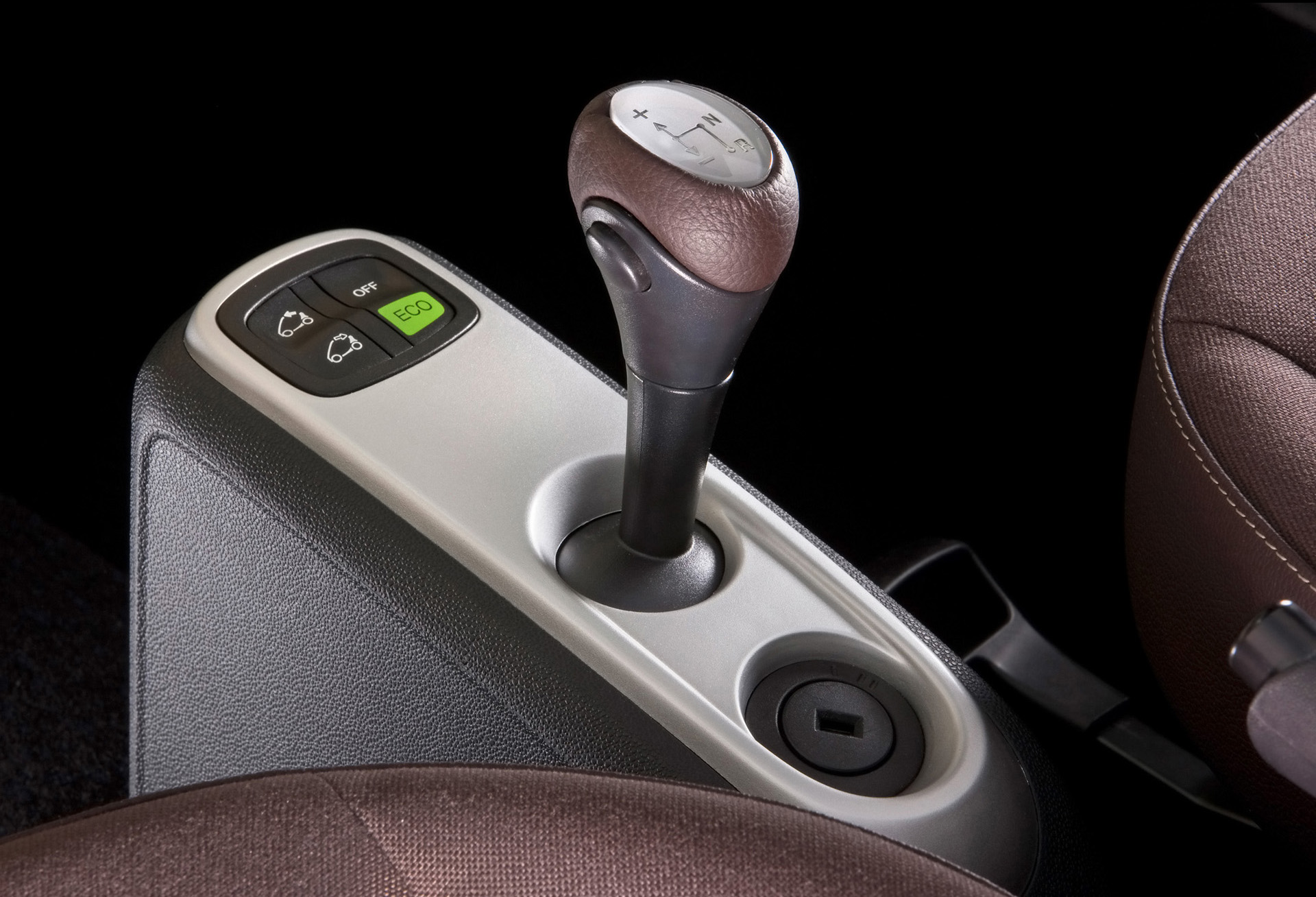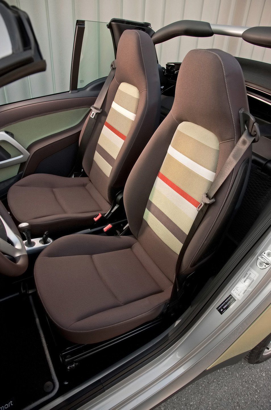 The interior boasts an unusual, fresh design concept in terms of colours and materials. Here, the melon green metallic colour scheme is continued in an exclusive fabric design with shades of brown creating a stylish contrast, for example on the seats and in the door trim. The instrument panel featuring dark brown leather-effect details also continues the fresh play of colours that contrast with the green fabric. The 3-spoke sports steering wheel with steering wheel gearshift is covered with dark brown leather, as is the gear knob. Shimmering matt silver trim parts round off the harmonious impression of the interior.