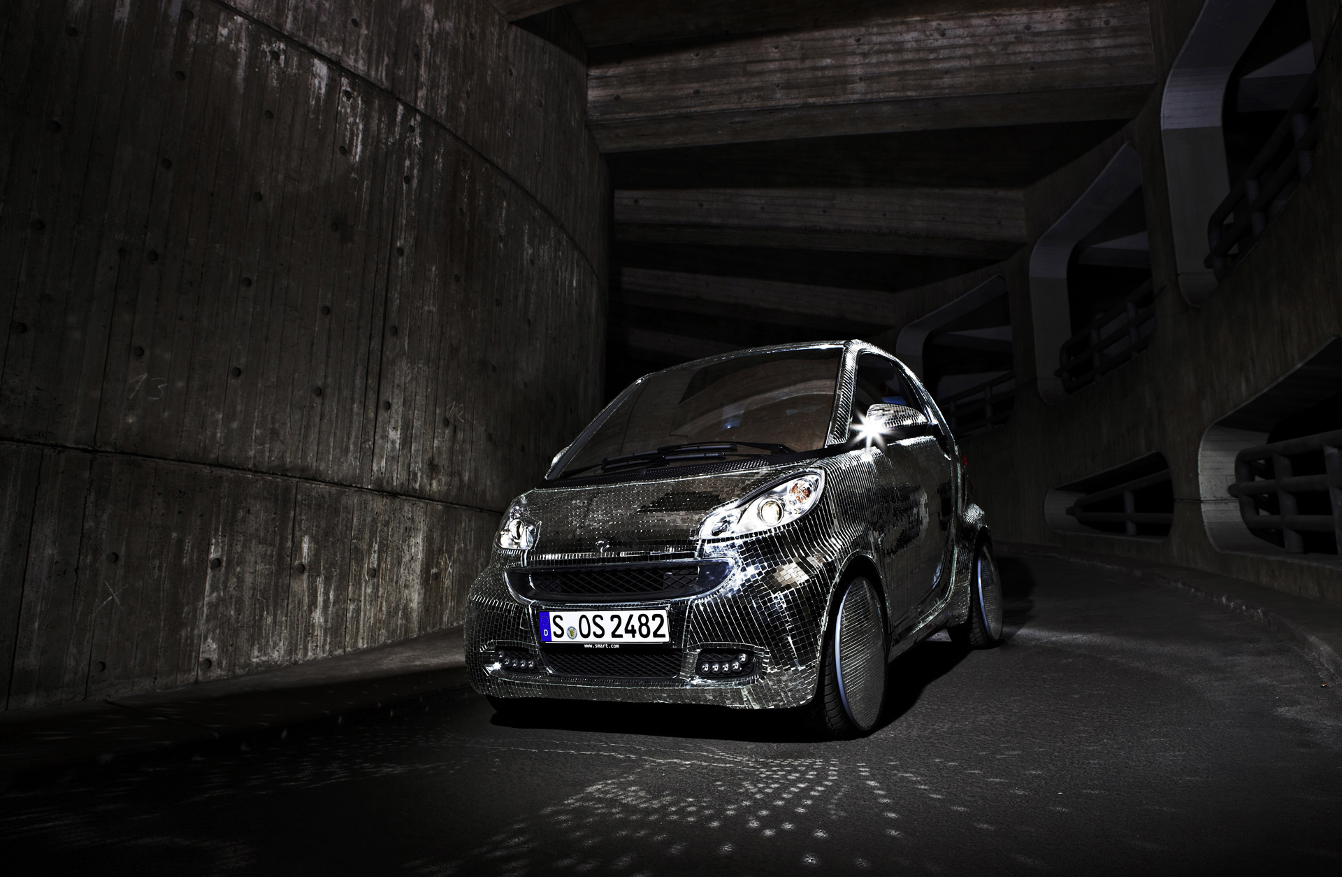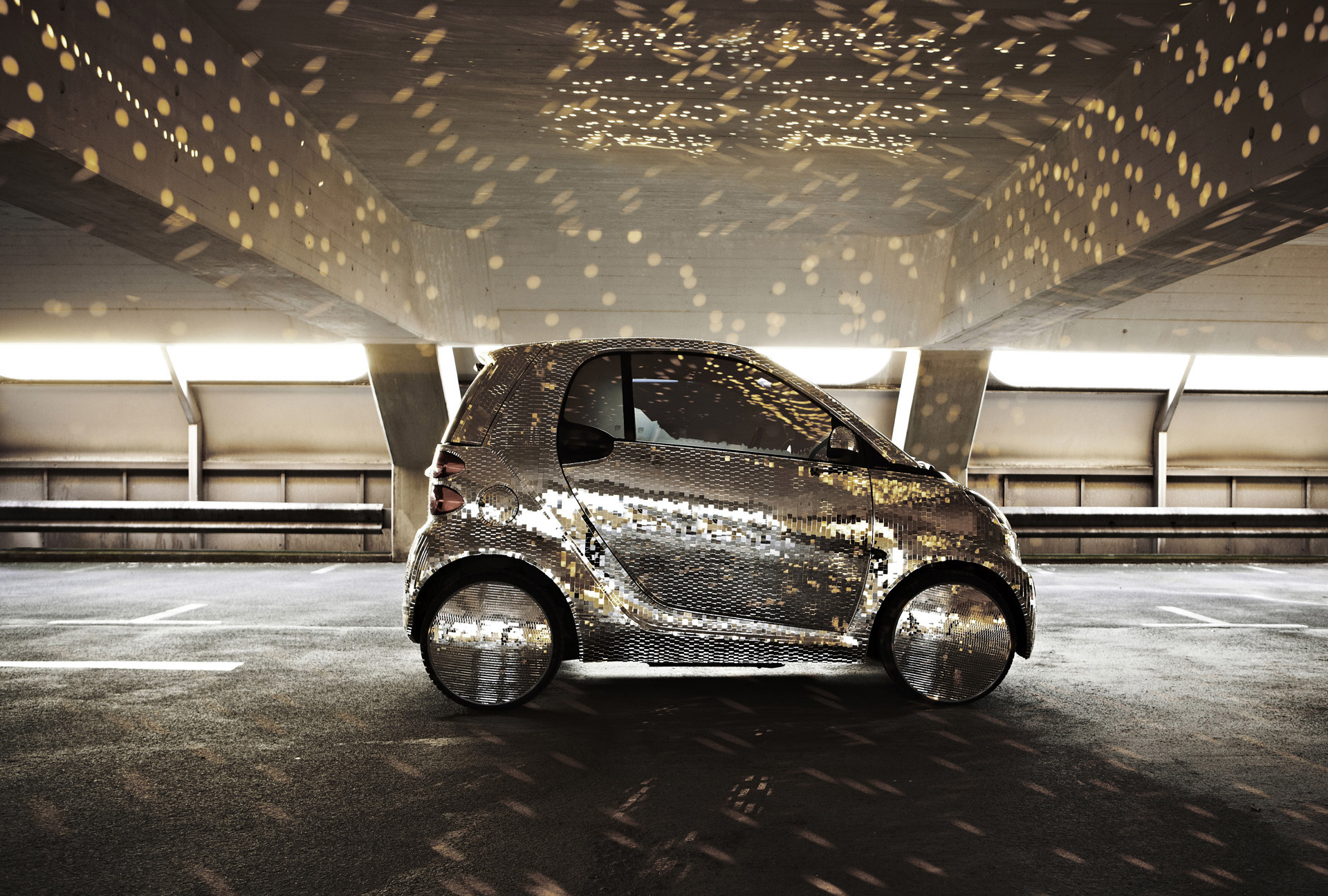 Always surprisingly different: smart presents an electric two-seater in a glitzy 'disco-ball' look in Berlin. This smart fortwo electric drive is completely covered in reflective glass tiles from the roof to the hub caps and the windows also feature a mirror finish. The one-off model was conceived by the experimental artist formation 'Apparatjik' to be used in a film titled 'Pixel City', realized for their current installation at Neue Nationalgalerie in Berlin. The project is brought to a climax by two very unusual live performances on the 26th and 27th of March.