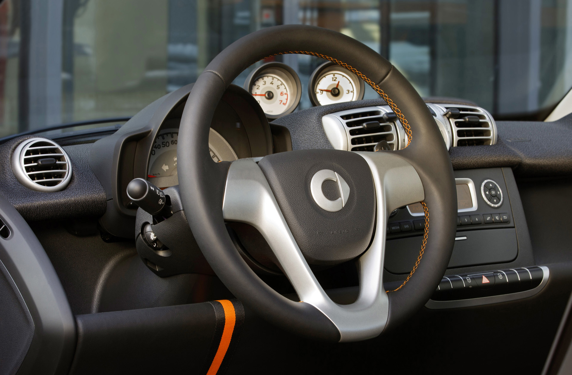 The interior takes up the colour concept of the body with a design that is both sporty and chic: the black seats in a mix of leather and fabric have an orange sport stripe in the middle, as does the knee pad in leather look. They provide a dramatic contrast to the black door trim and black instrument panel. Contrast components such as the instrument trims are painted in pearl black. The 3-spoke sports steering wheel with steering wheel gearshift and the gear knob are covered with black nappa leather. The audio system basic (RDS radio with AUX/USB interfaces and two loudspeakers) is already on board as a standard feature of the smart fortwo nightorange, as are dashboard instruments (cockpit clock and rev counter).