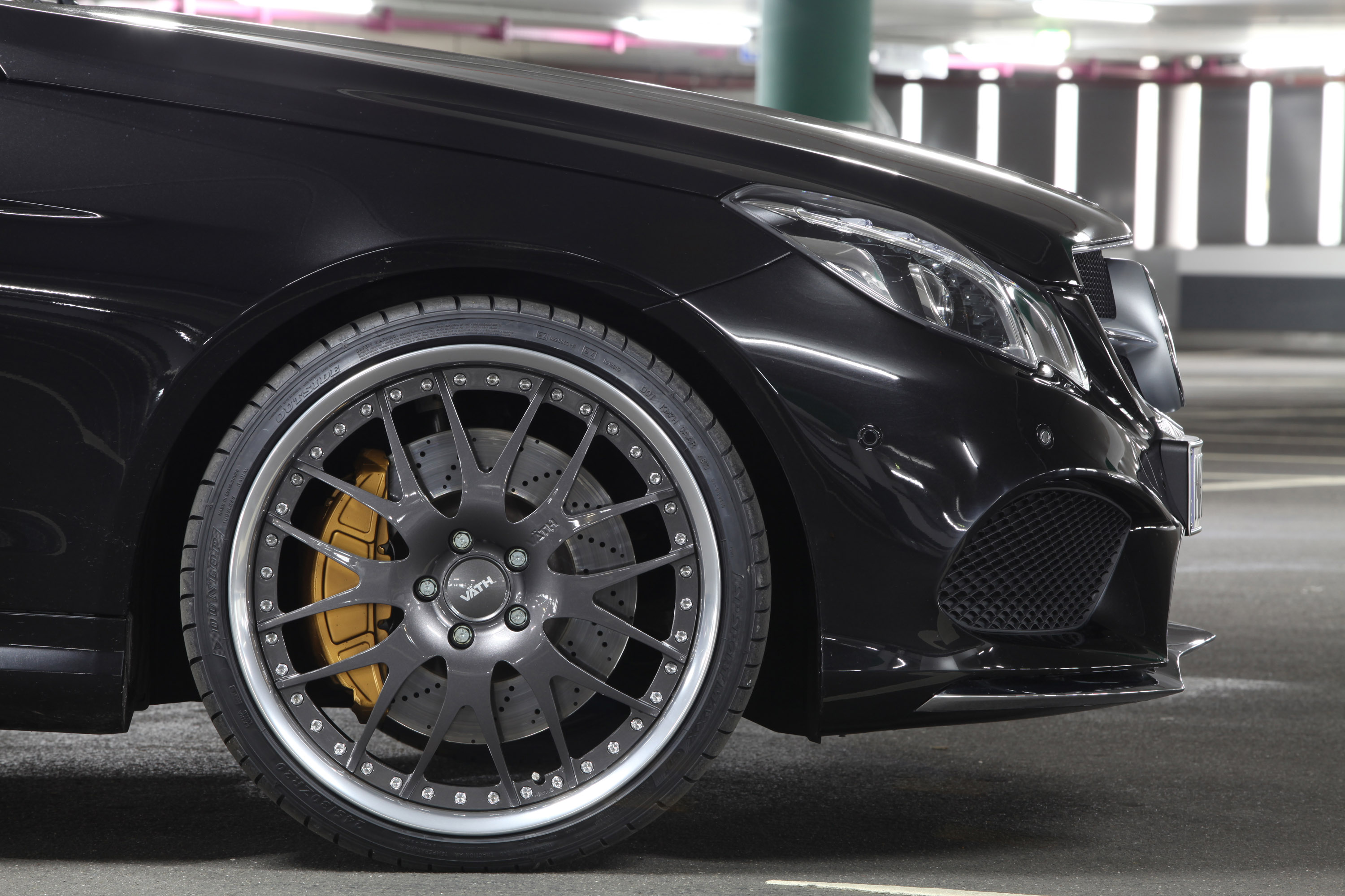 The connection between car and road is taken over by rims E 500 in 8.5x20 with tyres in 235/30R20 in front or in 10x20 with 275/25R20 at the back optimally adapted by VÄTH. Then it is necessary to mention trunk lip spoiler of carbon fibre (1,761.20 euro) as well various accessories, including carbon interior, sports steering wheel and aluminium pedals.